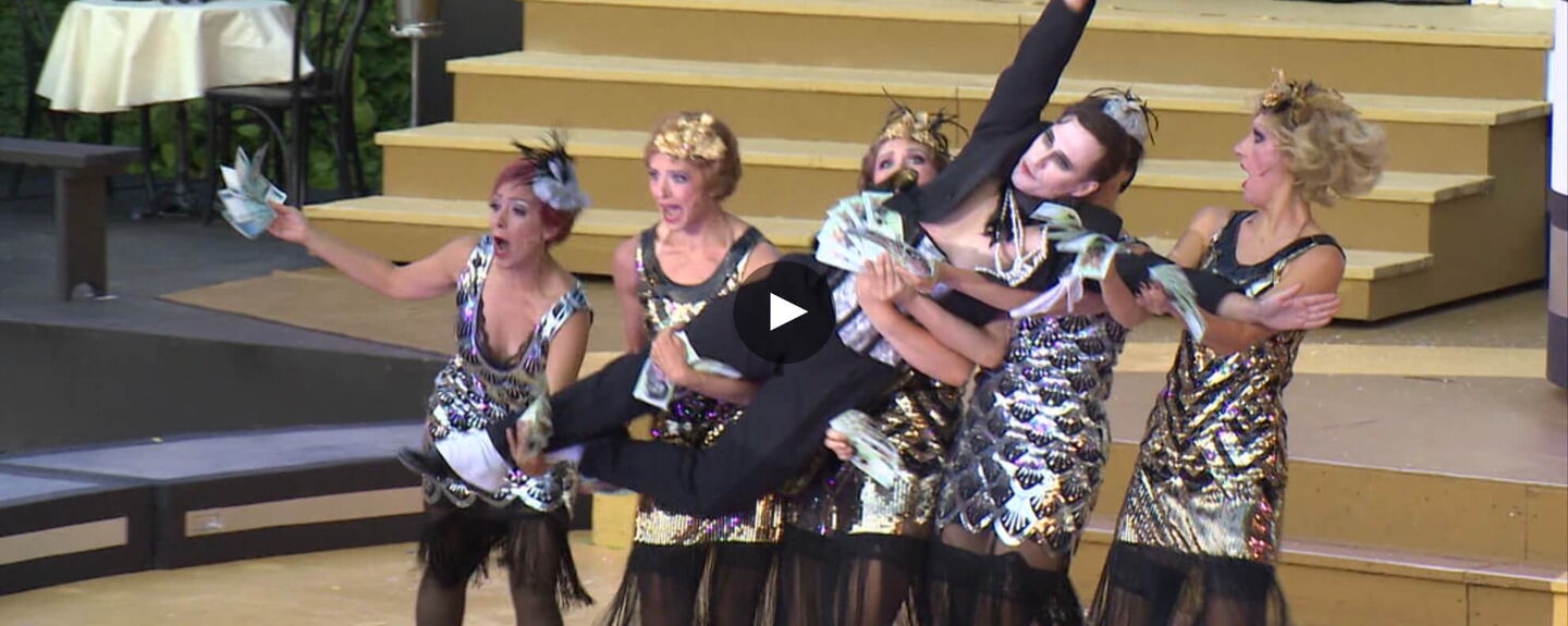Ockerfarbene Treppen, drei große schwarz-weiß gestreifte Kreise sind im Hintergrund zu sehen. Durch einen grauen Vorhang stolzieren elegant die Künstlerinnen und Künstler des "Cabaret". Auf dieser Bühne zwischen grünen Bäumen ist die Bühne vom fiktiven Berliner Kit-Kat-Club der 20er-Jahre angesiedelt, wo nun die echten Schauspielerinnen und Schauspieler in schwarz-weißen Kostümen die Künstler des "Cabaret" darstellen. Sie seien "hungrig" auf die Bühne und die Vorfreude sei groß, sagen sie.