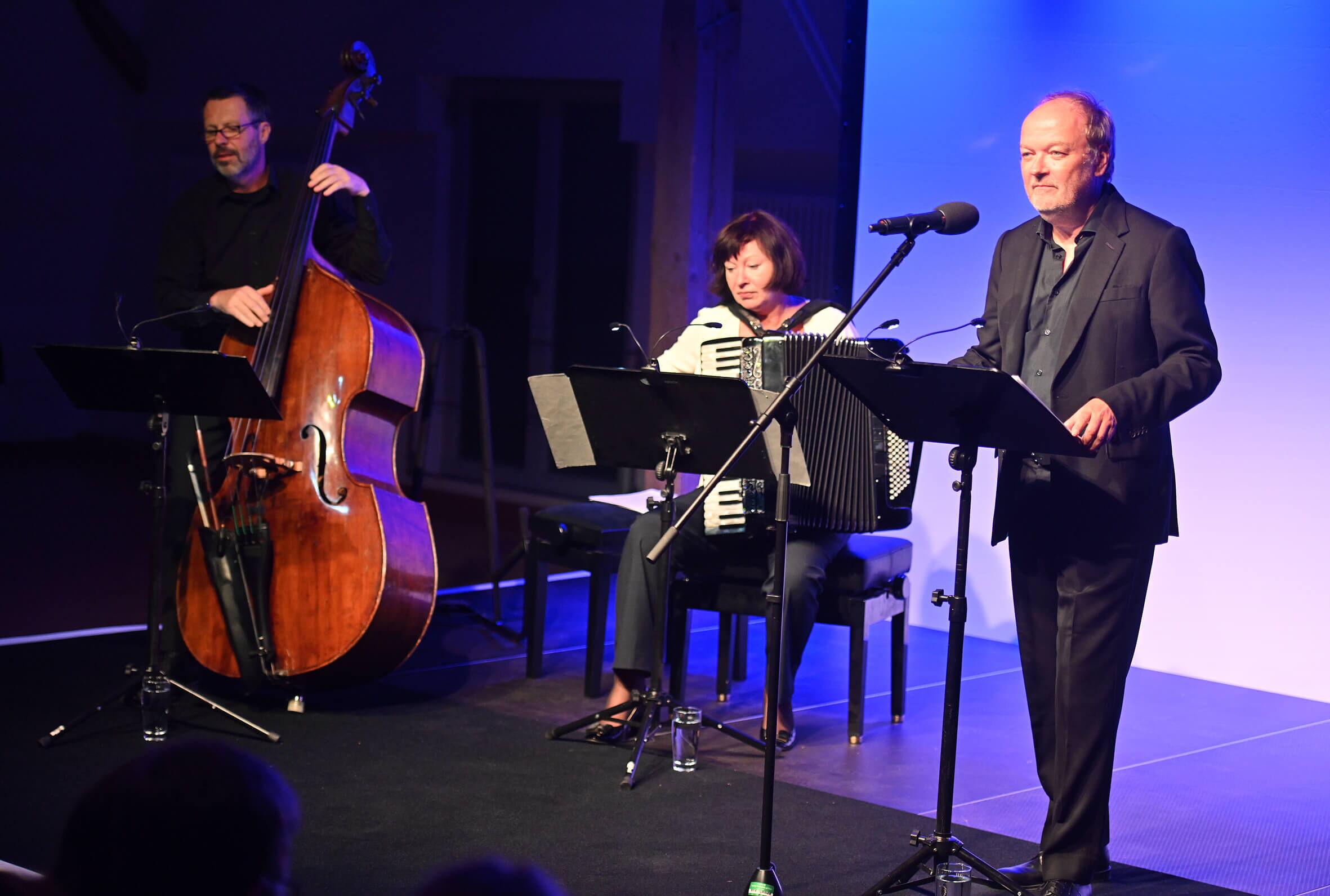 Musikalisch kongenial begleitet wurde der Hitchcock-Abend von Natalie Böttcher (Akkordeon) und Guido Jäger (Kontrabass). Beide haben größtenteils Kompositionen aus verschiedenen Hitchcock-Filmen gespielt. Das war von allen drei Beteiligten großartig. Sie ernteten frenetischen Applaus. Als Zugabe stimmte Jens Wawrczeck schließlich den Song „Senza Fine“ aus dem Aldrich-Spielfilm „Der Flug des Phoenix“ an – und überzeugte auch gesanglich.