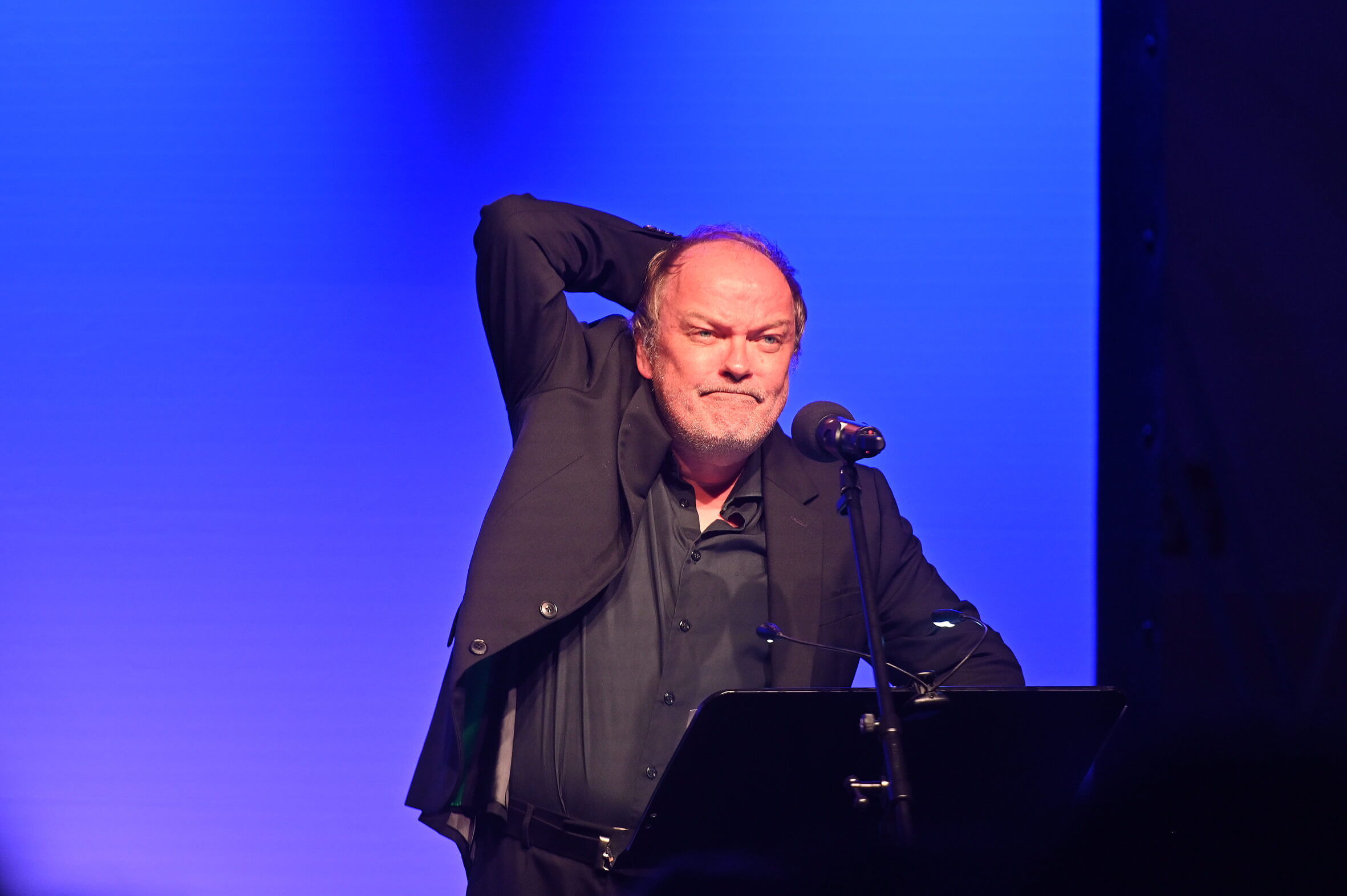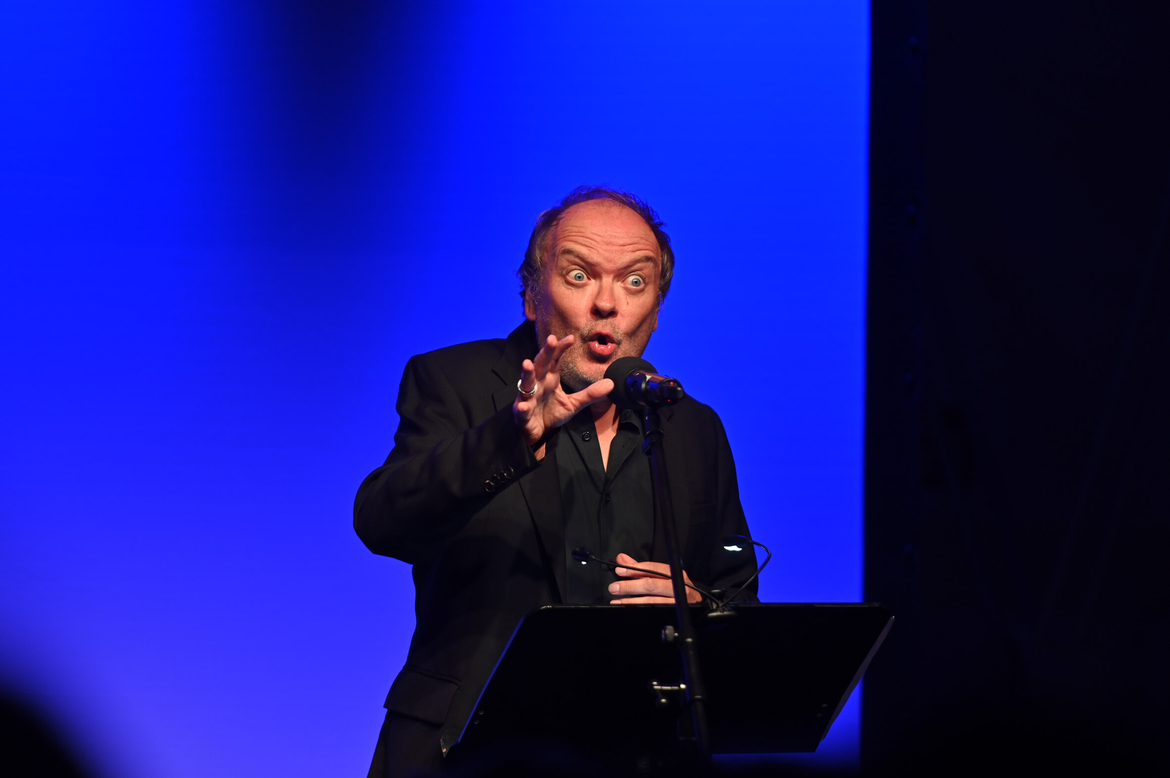 Ihnen wurde am Sonnabend, 16. September, eine fulminante szenische Lesung geboten. Allen Figuren in John Buchans Romanklassiker „Die 39 Stufen“ verlieh der Hamburger Schauspieler und Sprecher, der seit über 40 Jahren bekannt ist als Stimme von Peter Shaw in den „Die drei ???“-Hörspielen, eine individuelle Stimme. Mit ganzem Körpereinsatz war Wawrczeck bei der Sache und bot einige Passagen fast wie in einer Theateraufführung auswendig dar.