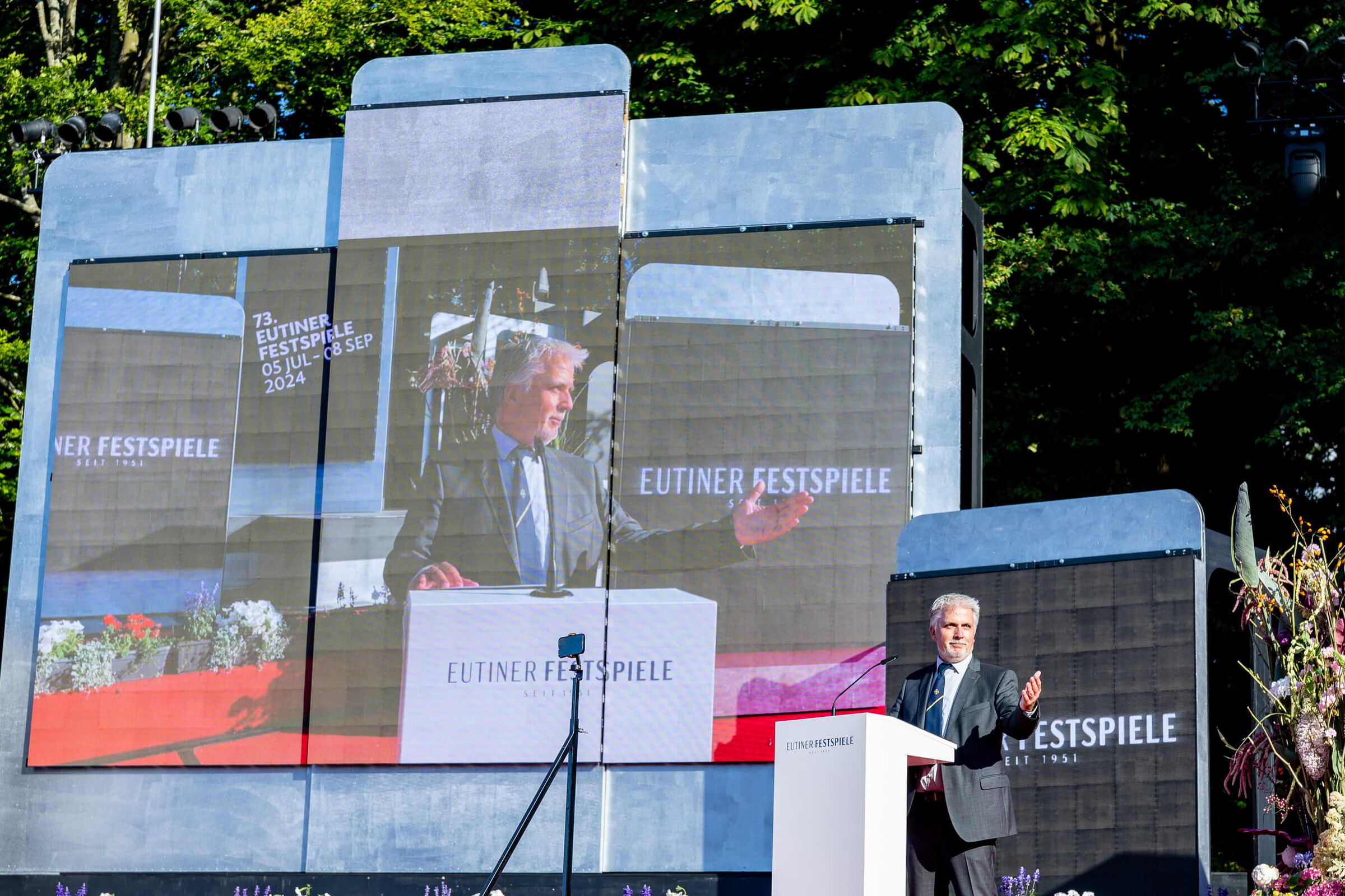Bürgermeister Sven Radestock (Grüne) sprach gar von der schönsten Bühne Europas. Für Heiterkeit sorgte er mit einer Liebeserklärung im Namen der Eutiner an die neue Tribüne: „So wie Hamburg seine ‚Elphi‘ liebt, werden wir unsere Seebühne lieben – unsere ‚Seebü‘!“, sagte der Bürgermeister, der auch von Problemen berichtete, wie Lieferschwierigkeiten für das Gestühl der Tribüne, das deswegen beinahe nicht pünktlich zur Saison aufgebaut gewesen wäre.