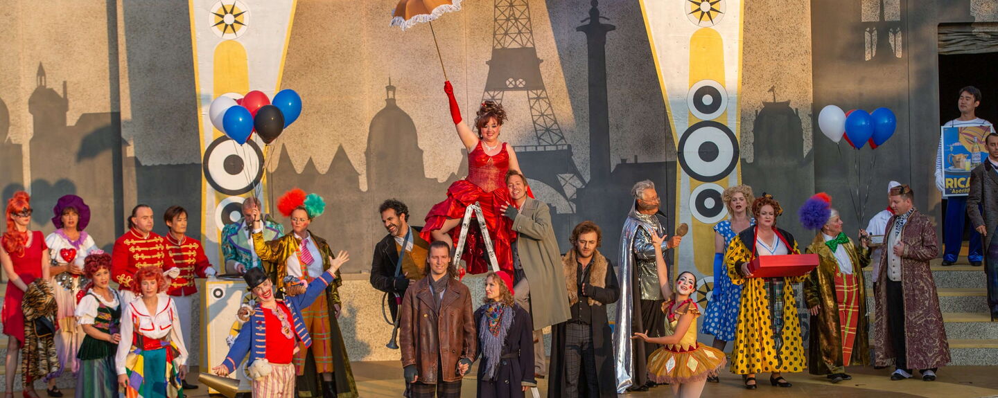 Ines Lex gab eine aufgedreht-ordinäre Musetta mit einnehmend fraulich-mitfühlenden Facetten im Pianobereich – dazu angemessene Charakterstudien der vielen anderen Akteure. Nicht zu vergessen der von Sebastian Borleis bestens einstudierte Festspielchor, der im zweiten, quietschbunten Bild ein quirliges Zirkusvölkchen imaginierte.