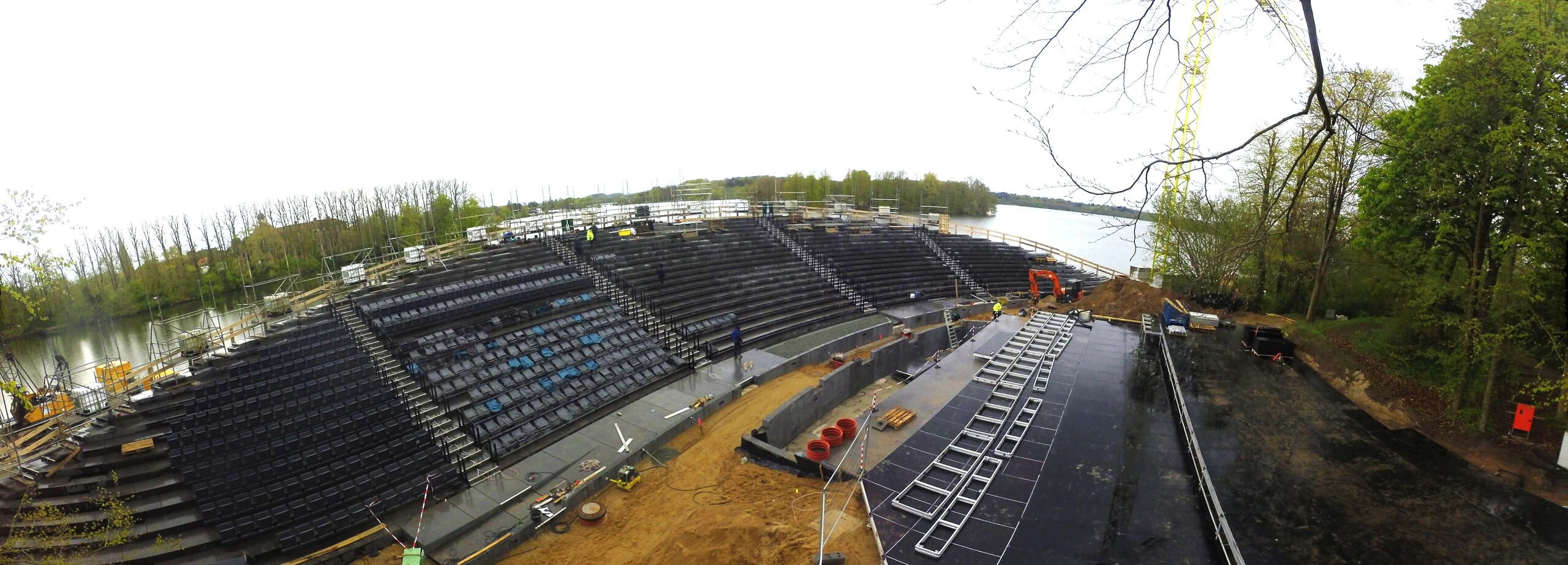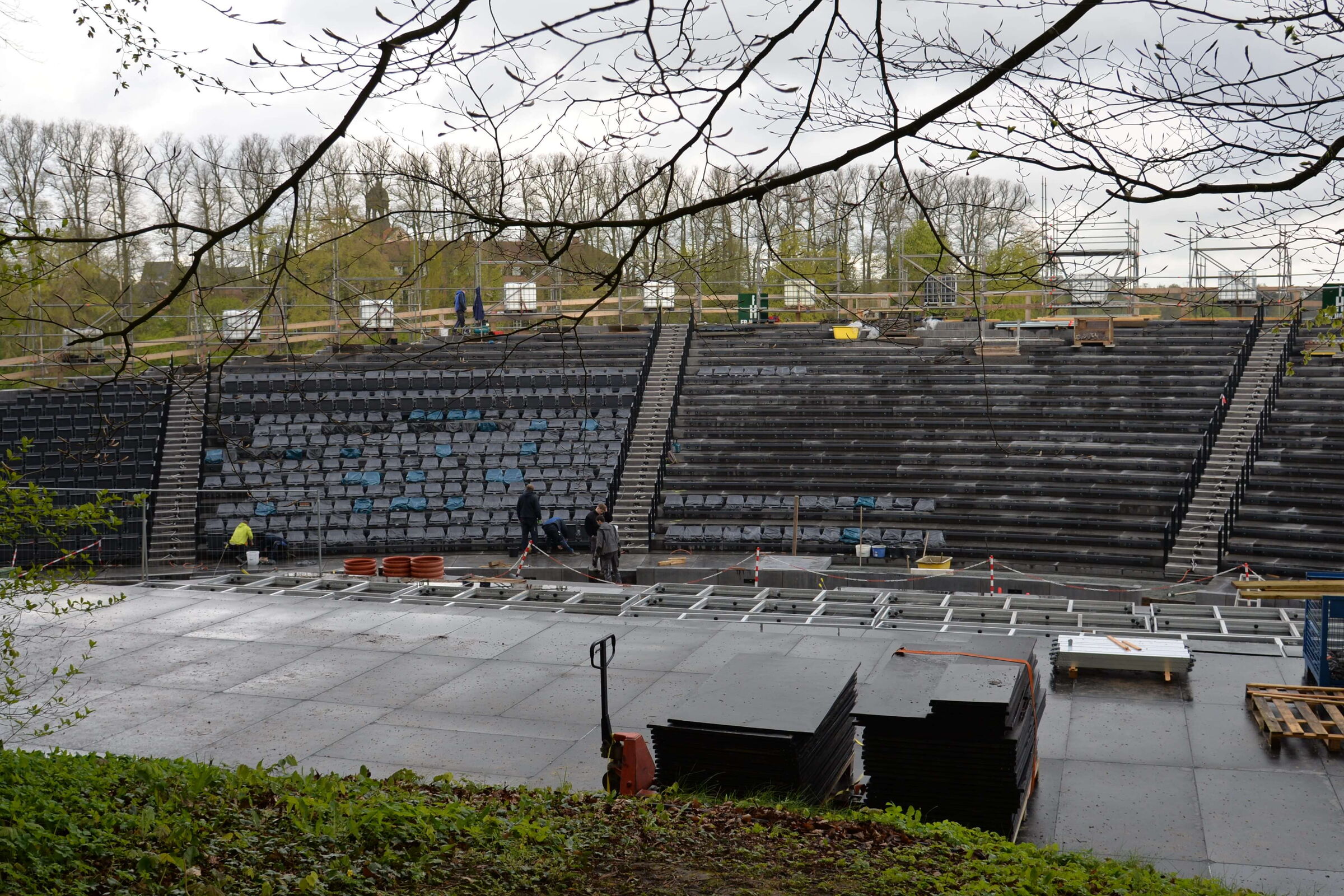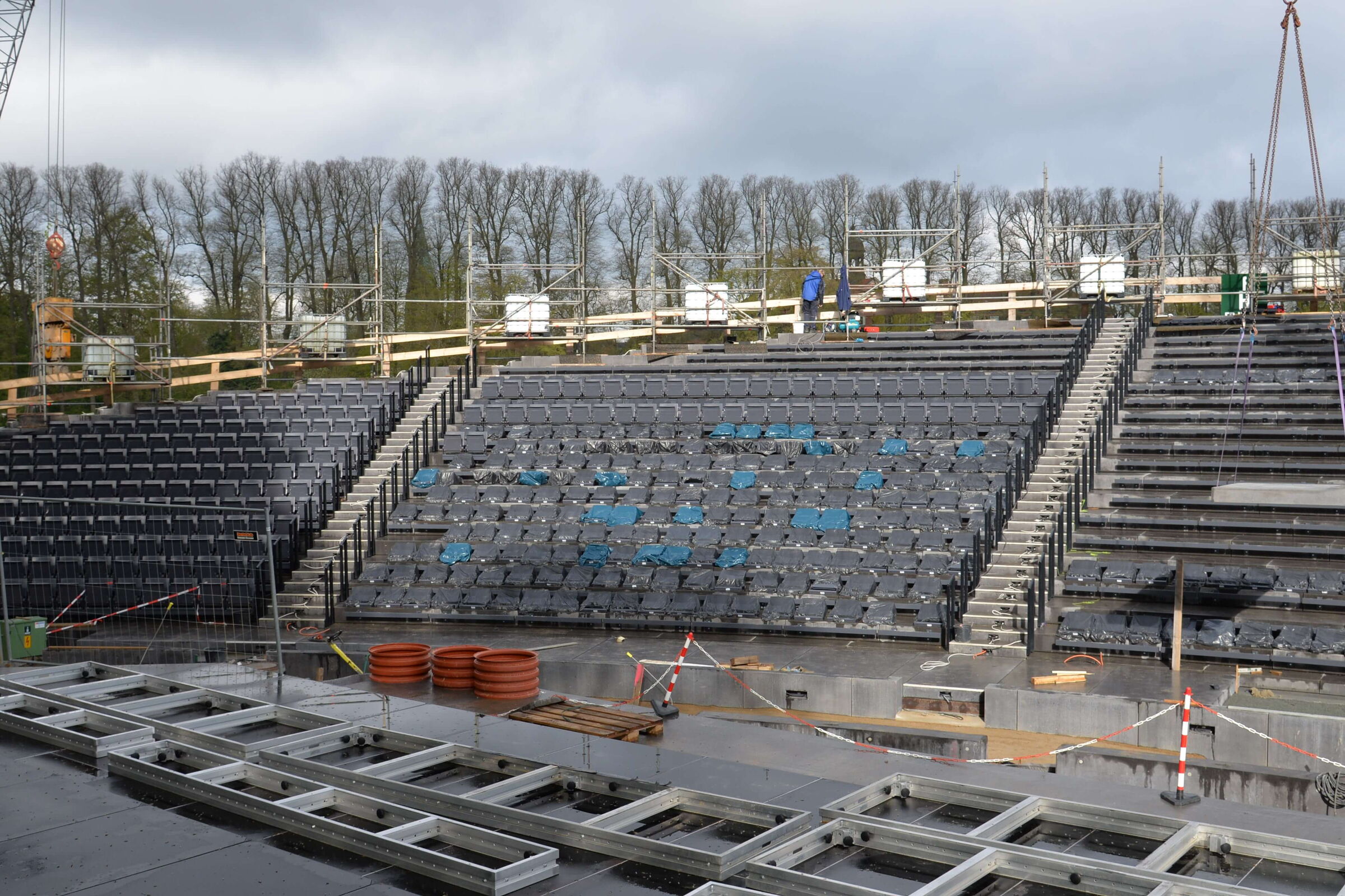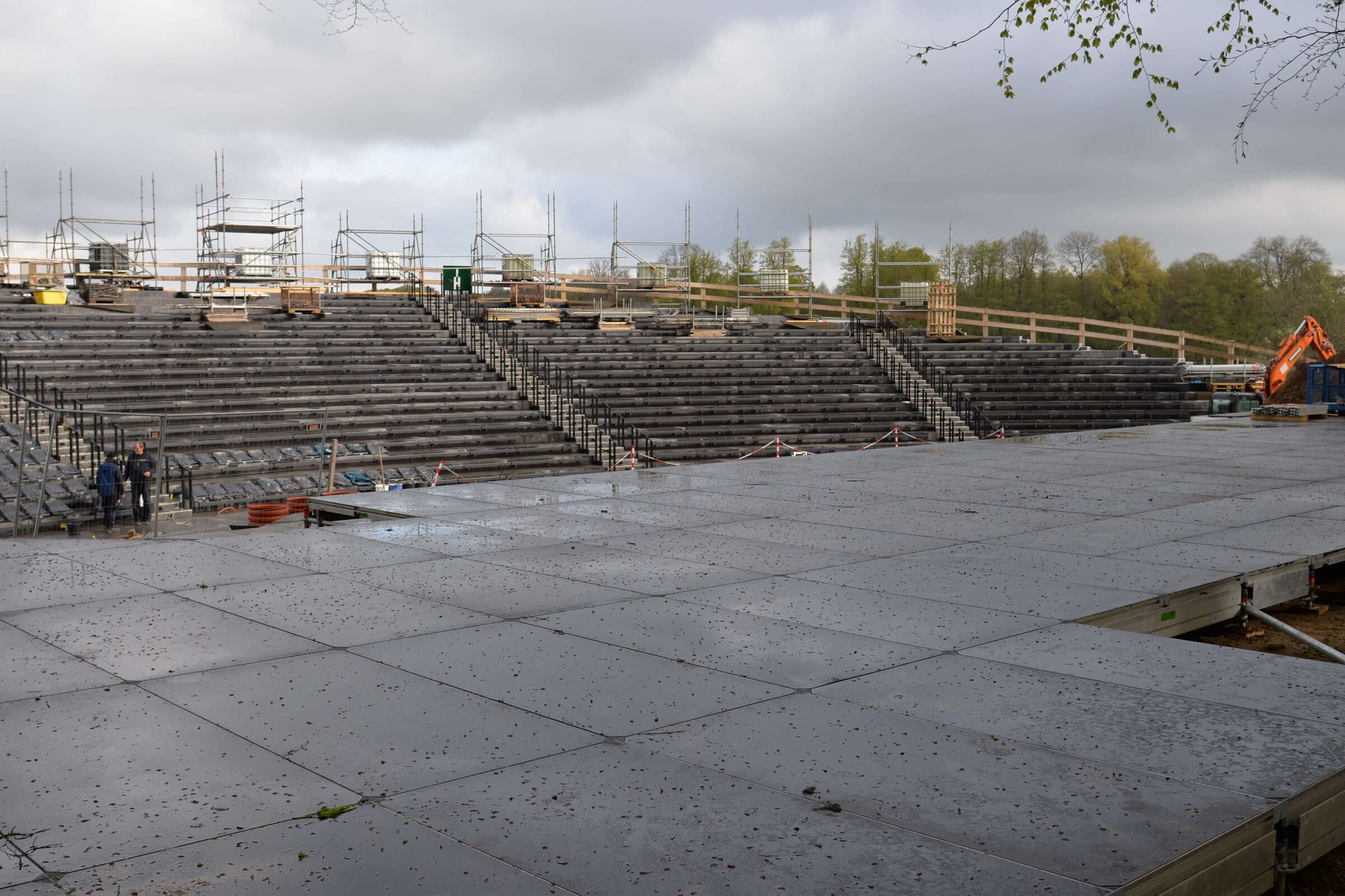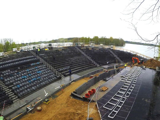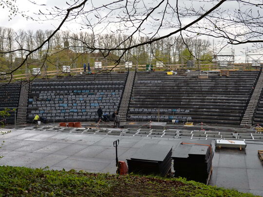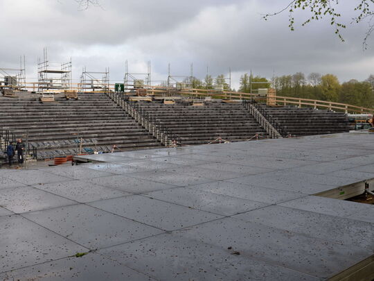 Es hänge einiges an Logistik an dem Bau dieser Tribüne, wo Beton-, Holz- und Stahlbauer eng verzahnt zusammenarbeiten. Und dann begännen bald schon die Proben für das Musical „Jesus Christ Superstar“, während denen die Arbeiten dann jeweils stundenweise ruhen müssen. Aber er habe keinerlei Zweifel daran, dass die Tribüne pünktlich eröffnen werde.