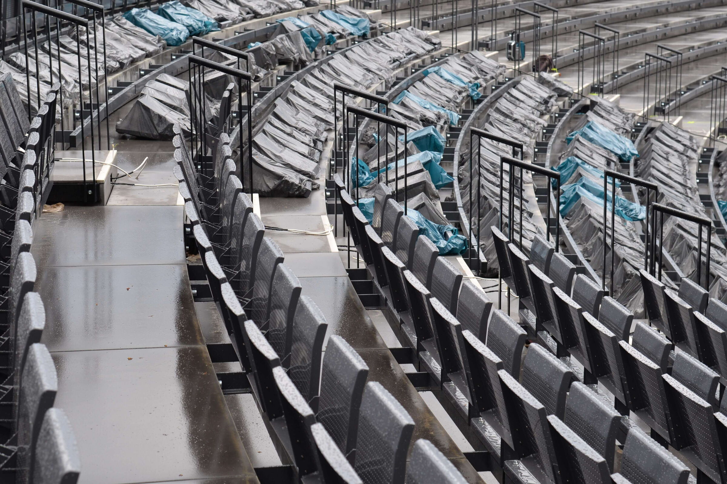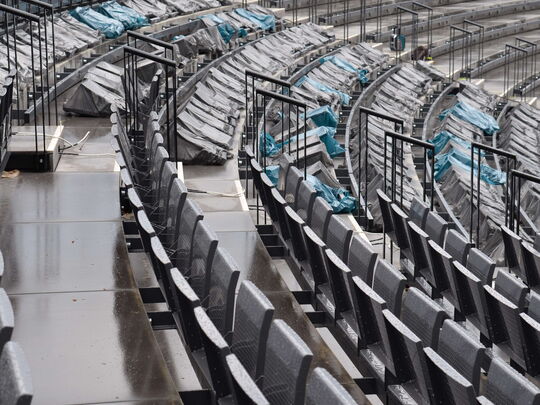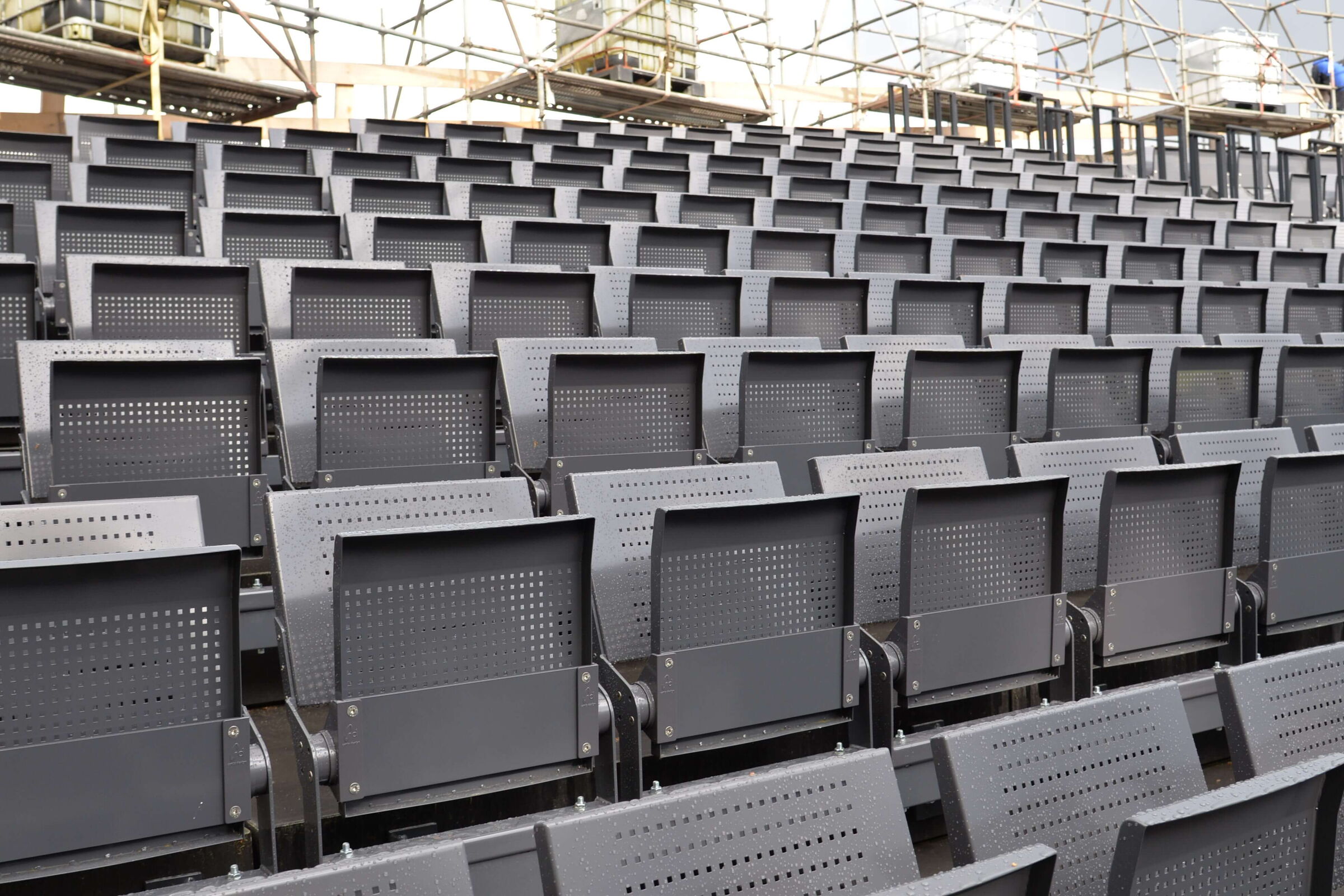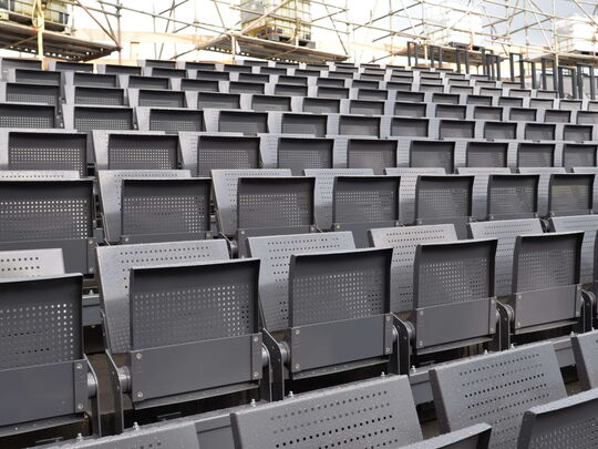 Die Metallbauer schweißen derzeit hoch konzentriert, mit Helm und Lärmschutz die Konsolen für die Tribünenkonstruktion. Sieben verschiedene Gradzahlen sind dabei zu beachten, die Tribüne ist schließlich geschwungen, das macht die Konstruktion etwas tricky. An die meisten der mehr als 800 stählernen Konsolen werden später drei Stühle geschraubt, an einige wenige nur einer oder zwei. Jeweils mit vier Schrauben. Alles ist demontierbar. Und feuerverzinkt, das macht es besonders widerstandsfähig gegen Rost und Korrosion.