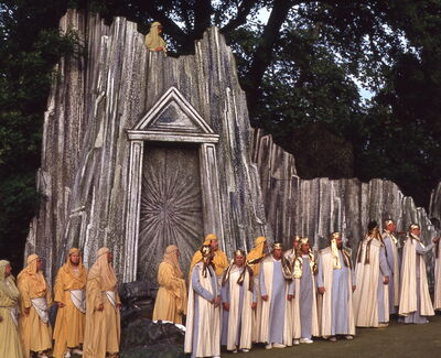 Schweige. – Im nächtlichen Garten schläft Pamina. Monostatos lauert ihr auf und will sich auf sie stürzen. Da erscheint die Königin der Nacht. Sie befiehlt Pamina, Sarastro zu töten und ihr den siebenfachen Sonnenkreis auszuliefern. Dieses Symbol der Macht hatte ihr Gatte, Paminas Vater, vor seinem Tode Sarastro übergeben. weil er die Herrschsucht der Königin fürchtete. Pamina schreckt vor dem Mord zurück. Sarastro rettet sie vor den Erpressungen des Monostatos, der heimlich gelauscht hat und tröstet sie, als sie um Gnade für ihre Mutter bittet, hier kenne man die Rache nicht. – Während Papageno es mit dem Schweigegebot nicht so ernst nimmt, bewahrt Tamino selbst Pamina gegenüber Schweigen. – Geschützt durch den Klang der Zauberflöte, bestehen Tamino und Pamina die beiden letzten Prüfungen gemeinsam, den Weg durch Feuer und Wasser. Sie werden in den Tempel der Eingeweihten aufgenommen. – Papageno hat versagt und sein Weibchen nicht bekommen. Verzweifelt will er sich an einem Baum aufhängen. Die drei Knaben erinnern ihn an sein Glöckchenspiel. Sobald es ertönt, erscheint Papagena, das Vogelweibchen. – Die Königin der Nacht. Monostatos und die drei Damen wollen heimlich in den Tempel eindringen. Vor den Strahlen der aufgehenden Sonne versinken die Mächte der Finsternis.