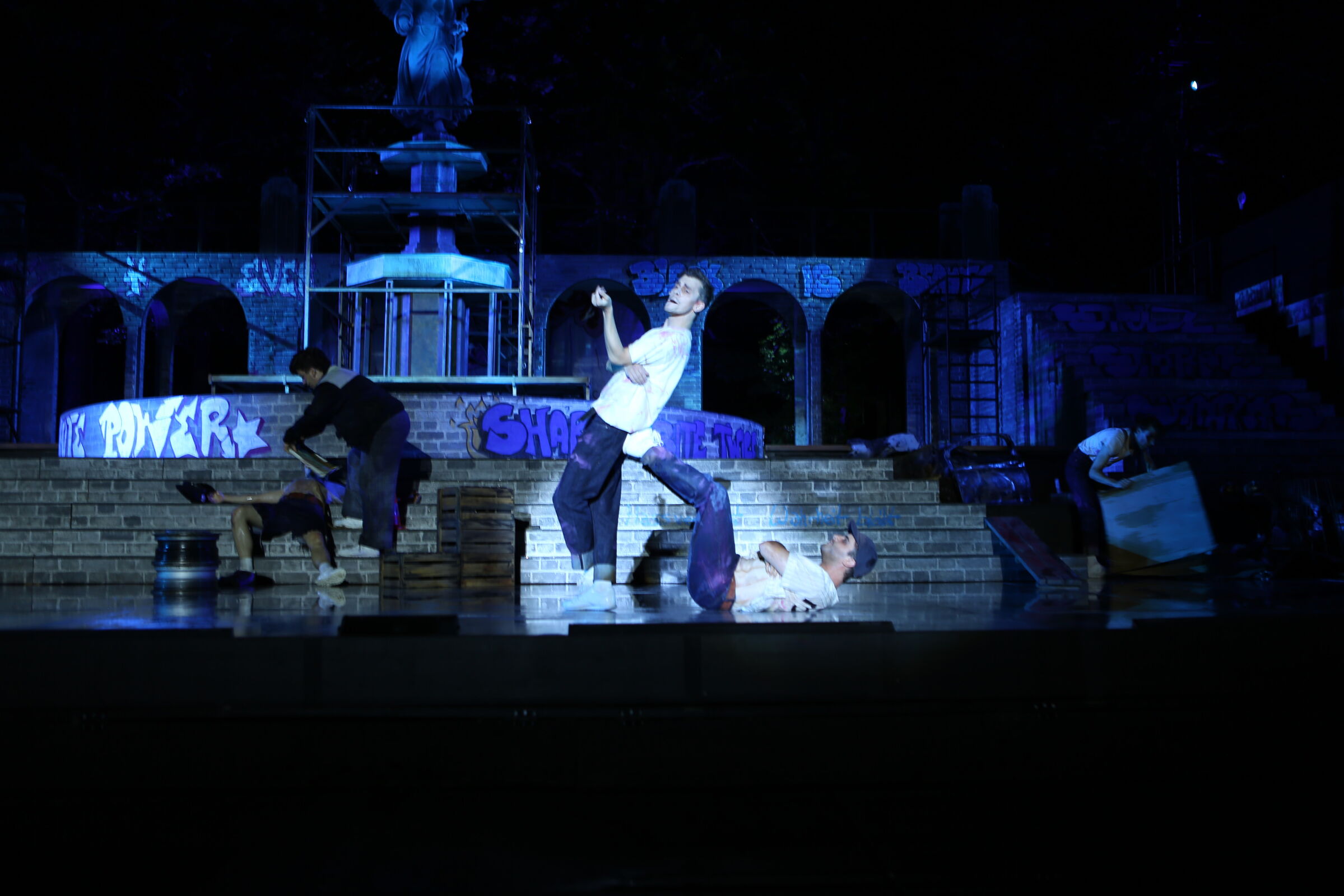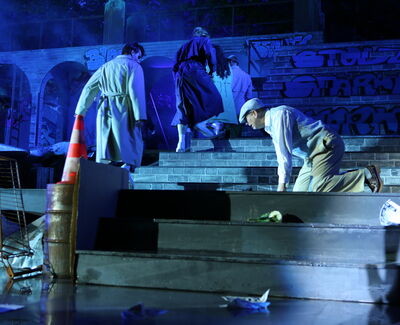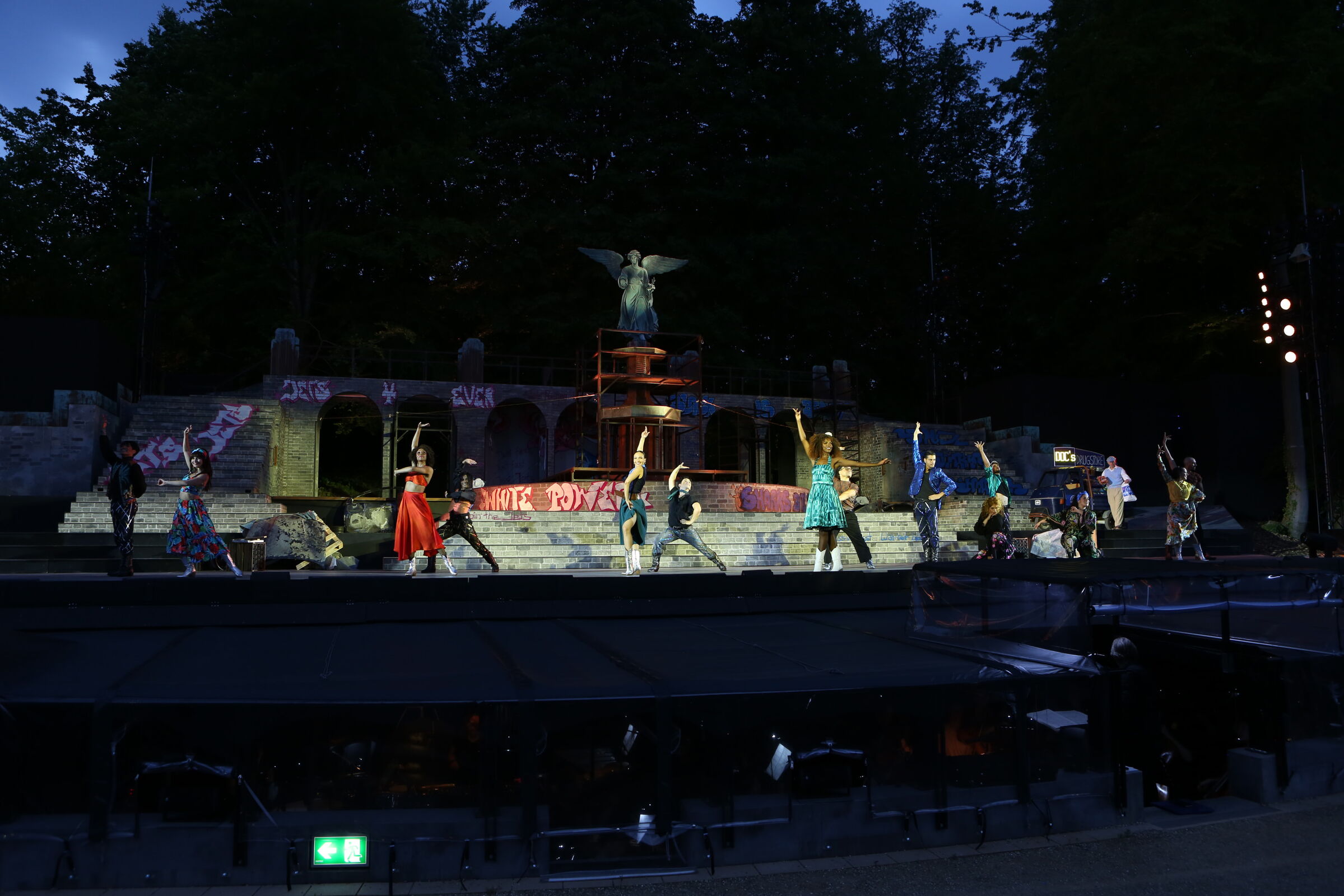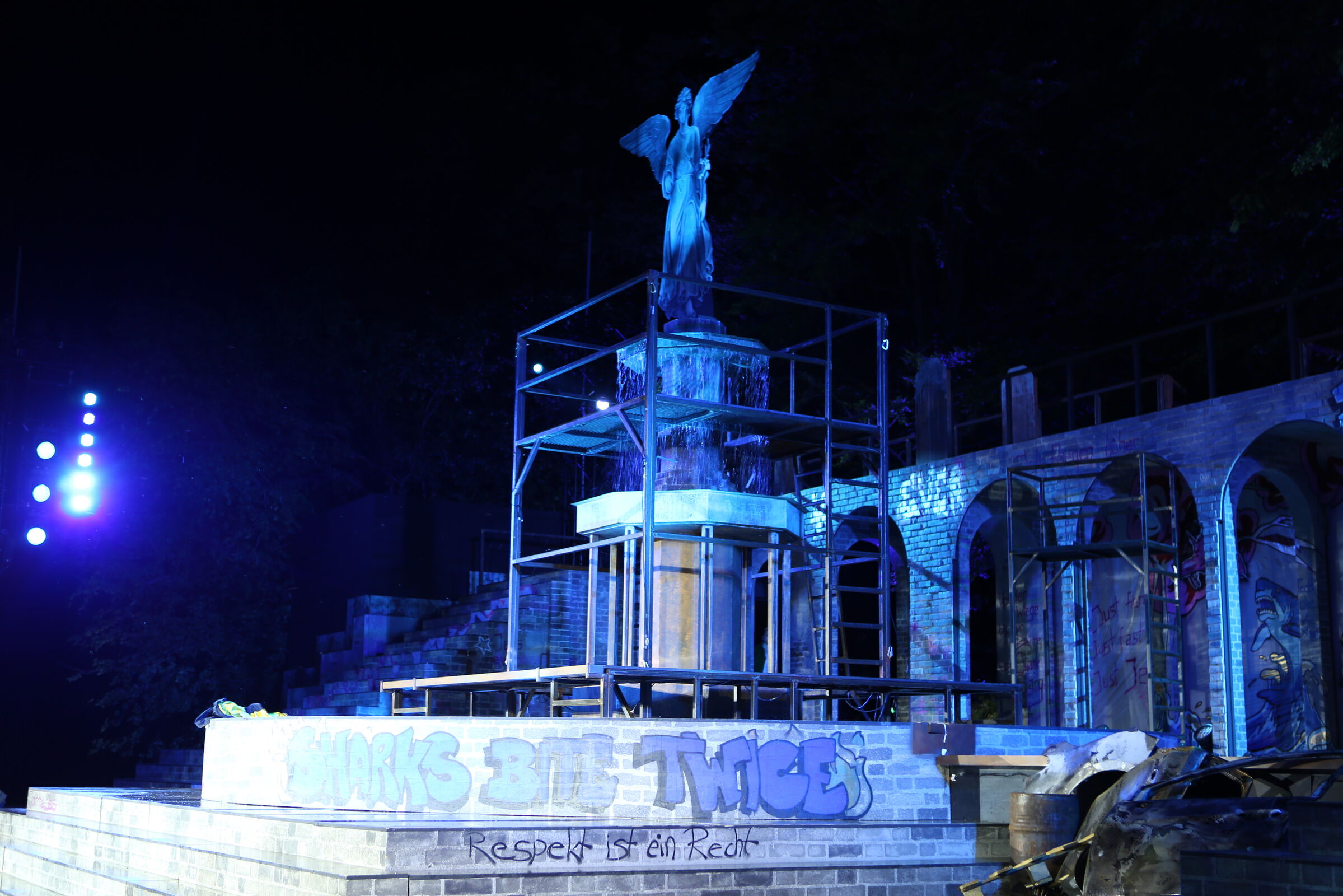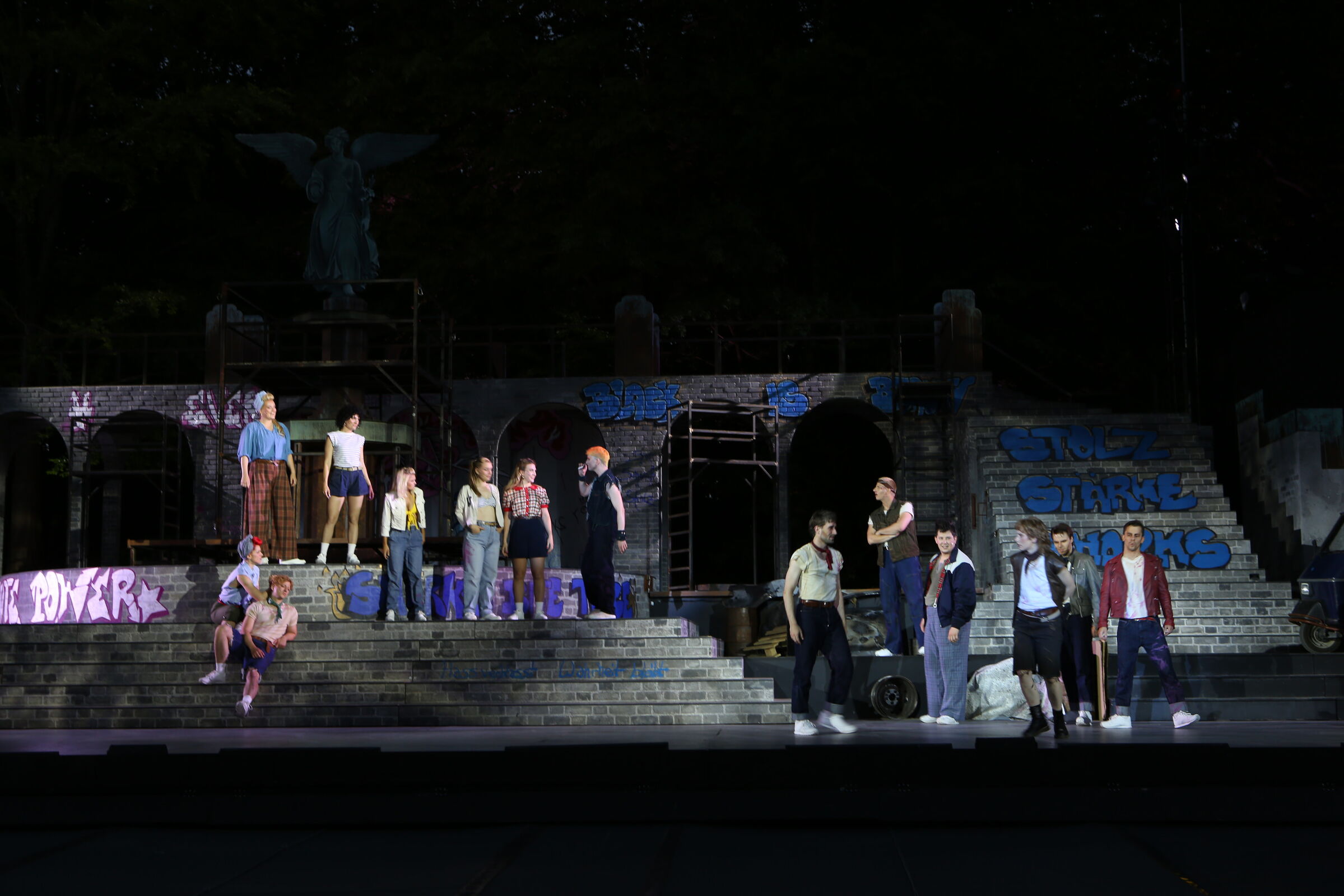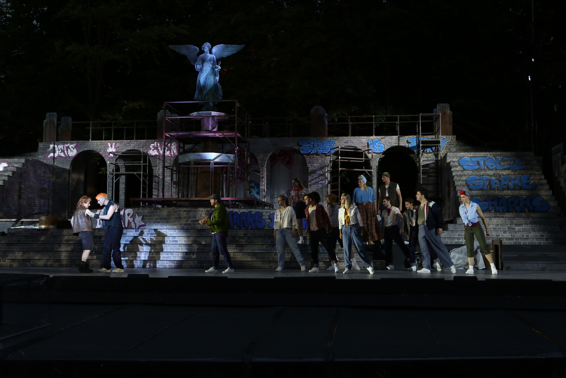 Da der Verlag für den Erhalt der Aufführungsrechte den Veranstaltern vorschreibt, das Musical im New York der 50er/60er Jahre anzusiedeln, lag es für mich nahe, die Szenerie in den Central Park zu legen. Bei meinen Recherchen bin ich auf Fotomaterial von der Bethesda Terrace und mit der im Vordergrund stehenden Bethesda Fountain gestoßen. Auch liegt dieser Platz mit seinem Arkadengang im Central Park am The Lake, so wie die neue Festspielbühne am Eutiner See. In meinem Bühnenbildentwurf sind aber die Arkaden mit den beiden großen Treppen, sowie der Brunnen mit dem Friedensengel nicht im schönen Sandsteinflair des Originalschauplatzes gestaltet, sondern alles ist viel verwahrloster und abgerockter, ein Lost-Place mit verrostetem Brunnen und Gerüsten. Eine in sich geschlossene, eigene Welt, in der Jets und Sharks, die beiden Gangs, nebeneinander existieren.