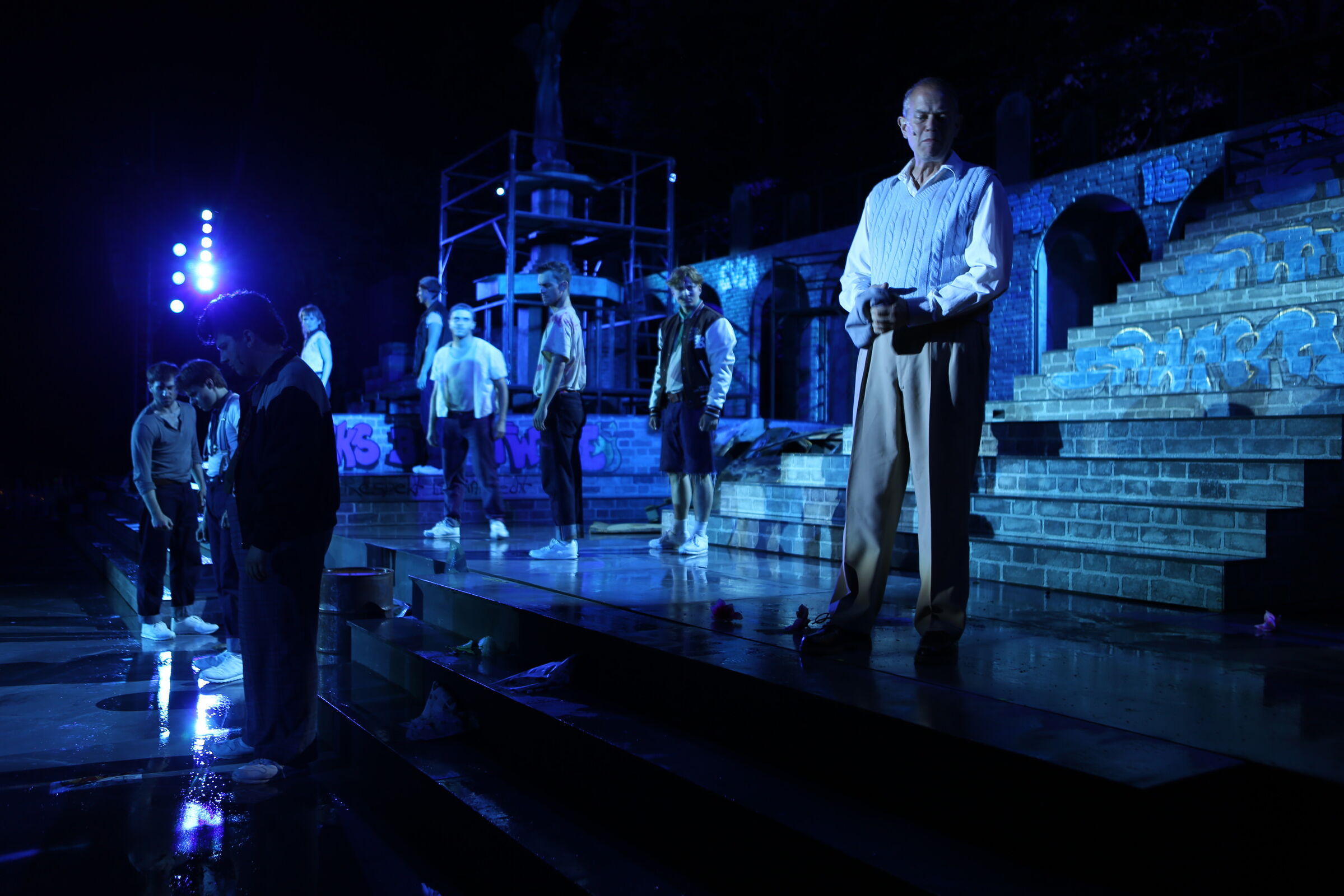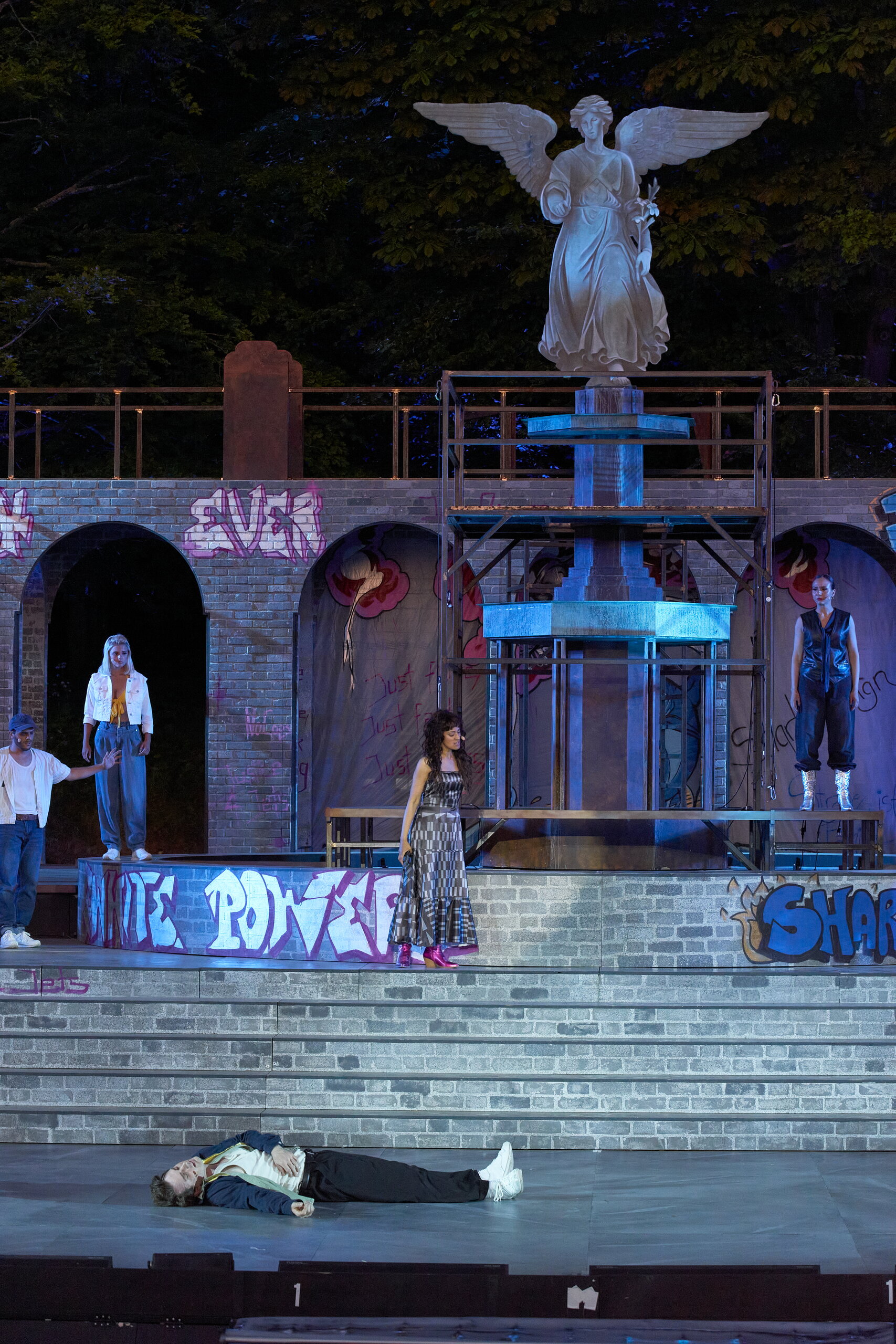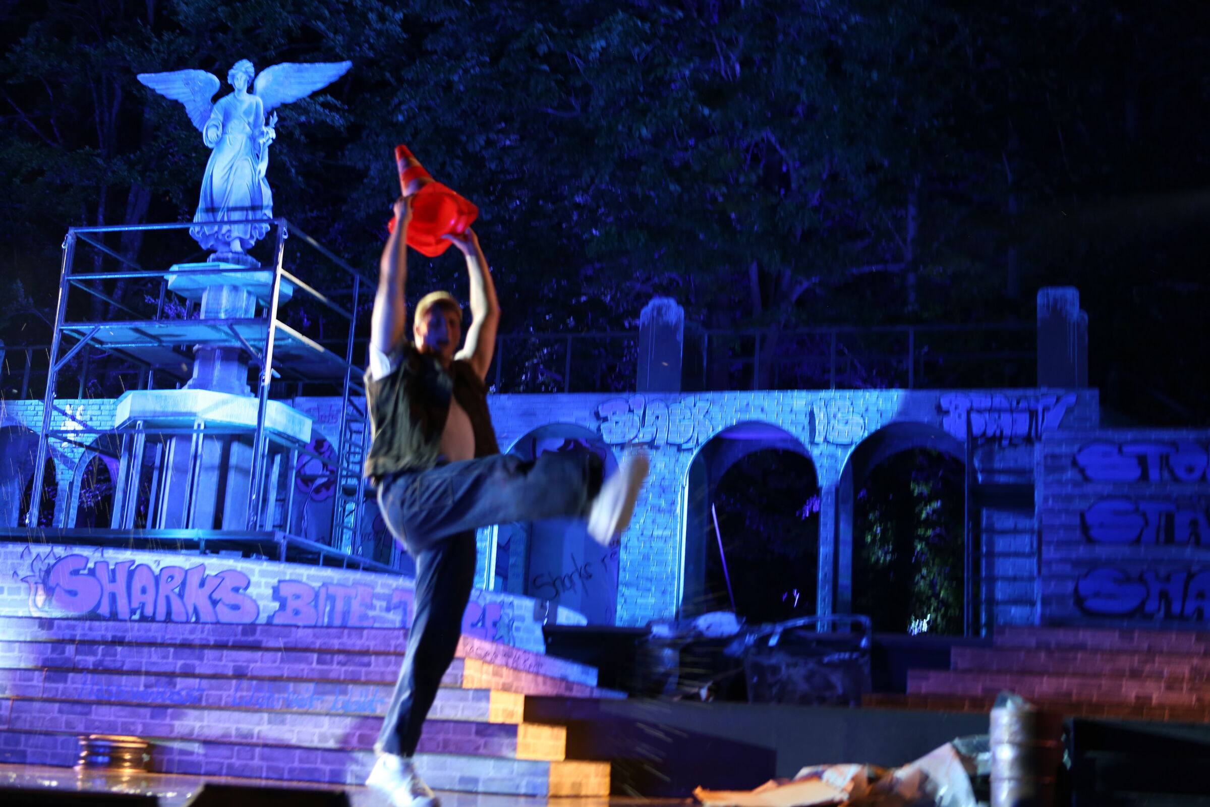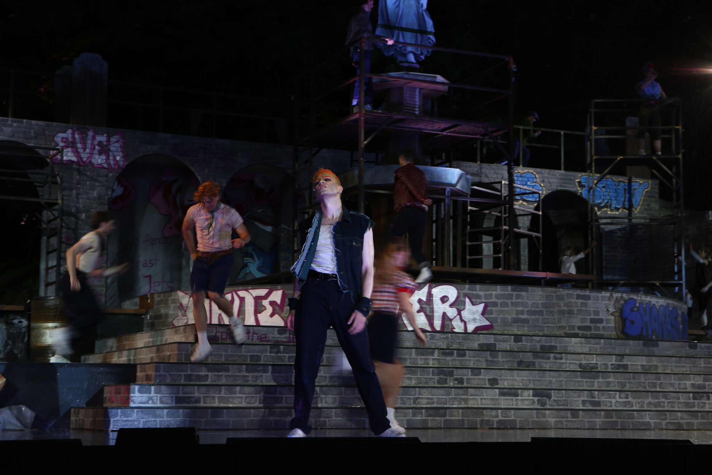 Da der Verlag für den Erhalt der Aufführungsrechte den Veranstaltern vorschreibt, das Musical im New York der 50er/60er Jahre anzusiedeln, lag es für mich nahe, die Szenerie in den Central Park zu legen. Bei meinen Recherchen bin ich auf Fotomaterial von der Bethesda Terrace und mit der im Vordergrund stehenden Bethesda Fountain gestoßen. Auch liegt dieser Platz mit seinem Arkadengang im Central Park am The Lake, so wie die neue Festspielbühne am Eutiner See. In meinem Bühnenbildentwurf sind aber die Arkaden mit den beiden großen Treppen, sowie der Brunnen mit dem Friedensengel nicht im schönen Sandsteinflair des Originalschauplatzes gestaltet, sondern alles ist viel verwahrloster und abgerockter, ein Lost-Place mit verrostetem Brunnen und Gerüsten. Eine in sich geschlossene, eigene Welt, in der Jets und Sharks, die beiden Gangs, nebeneinander existieren.