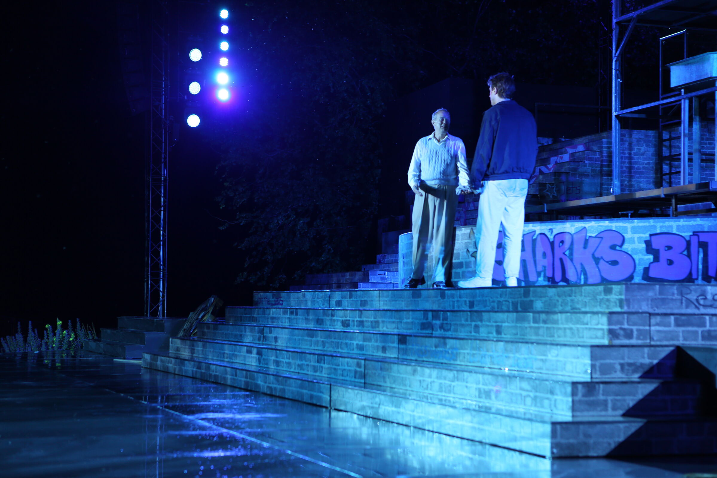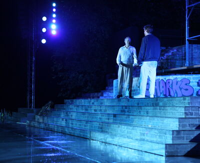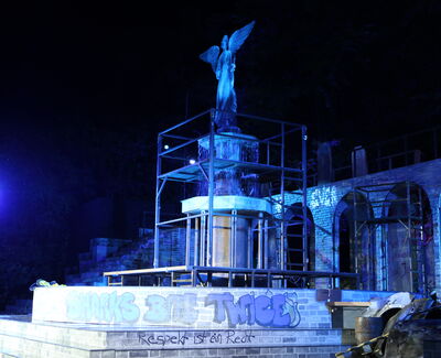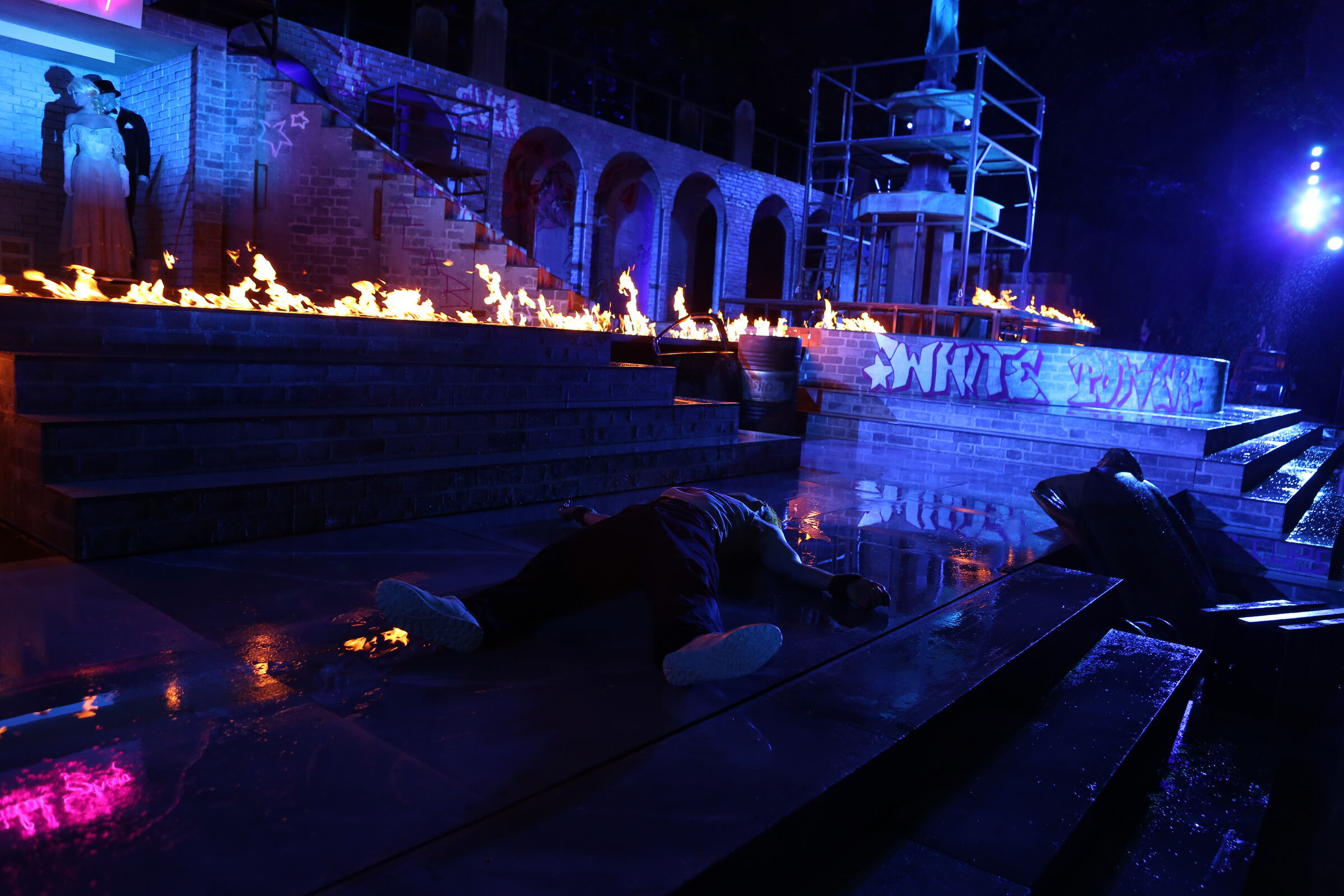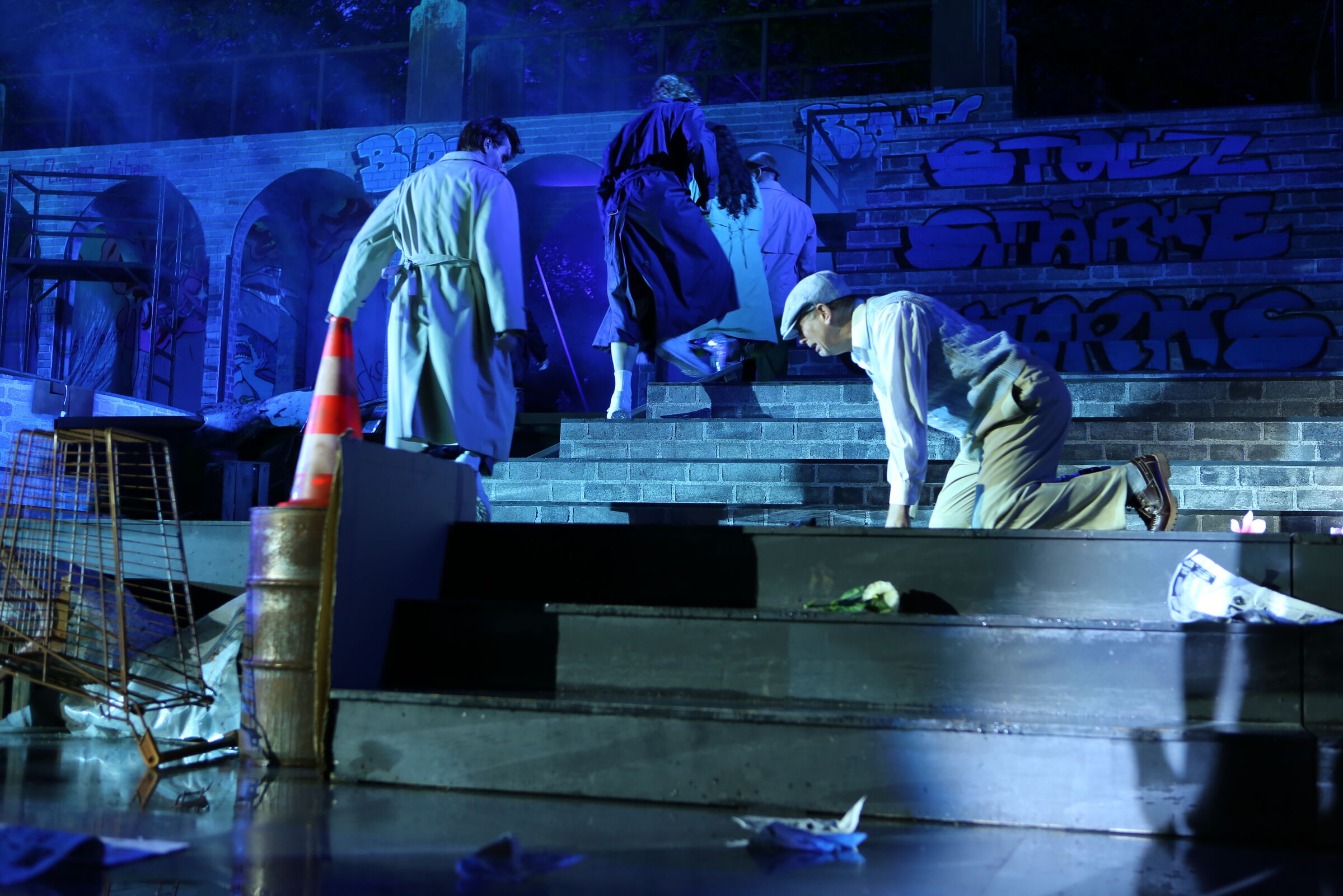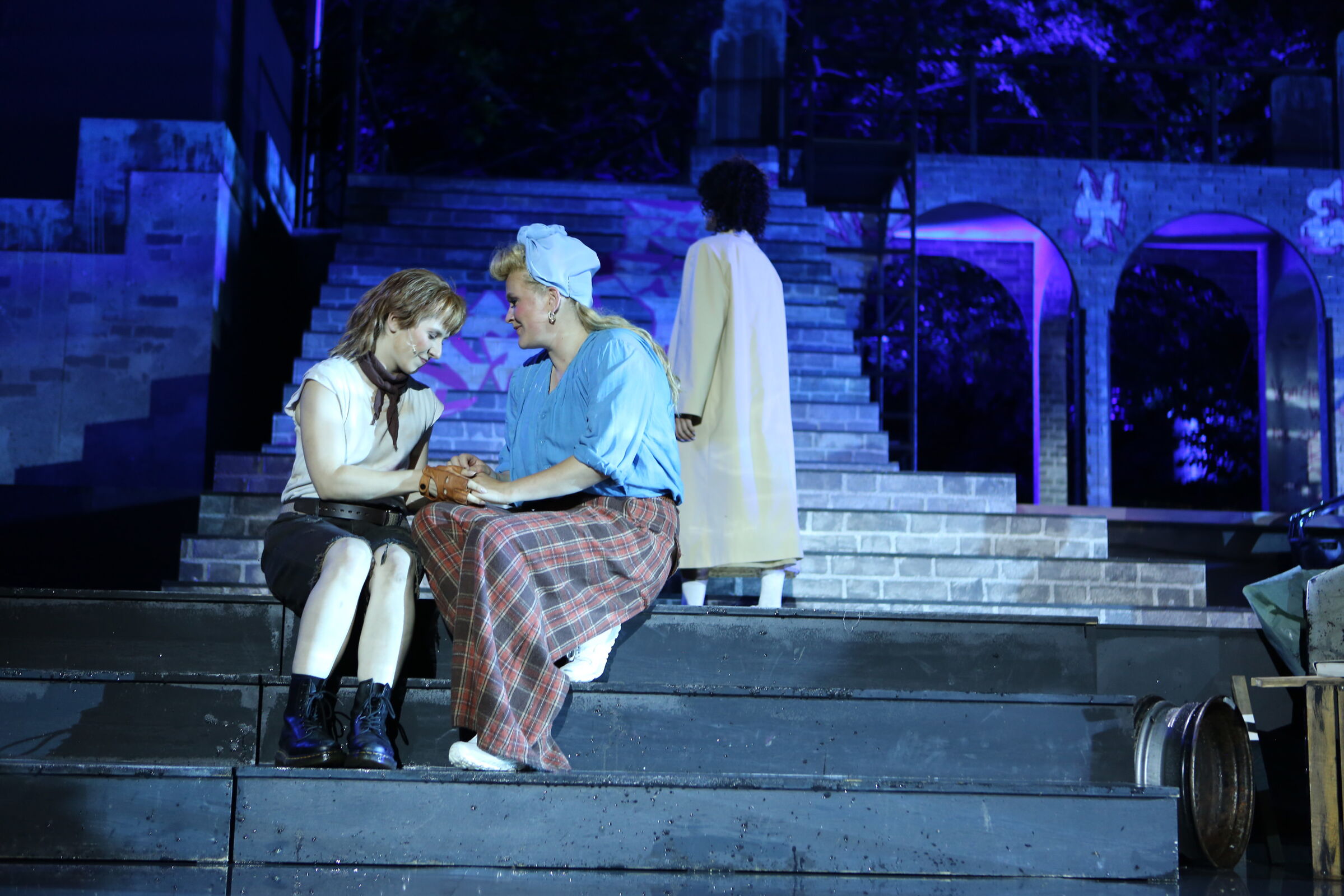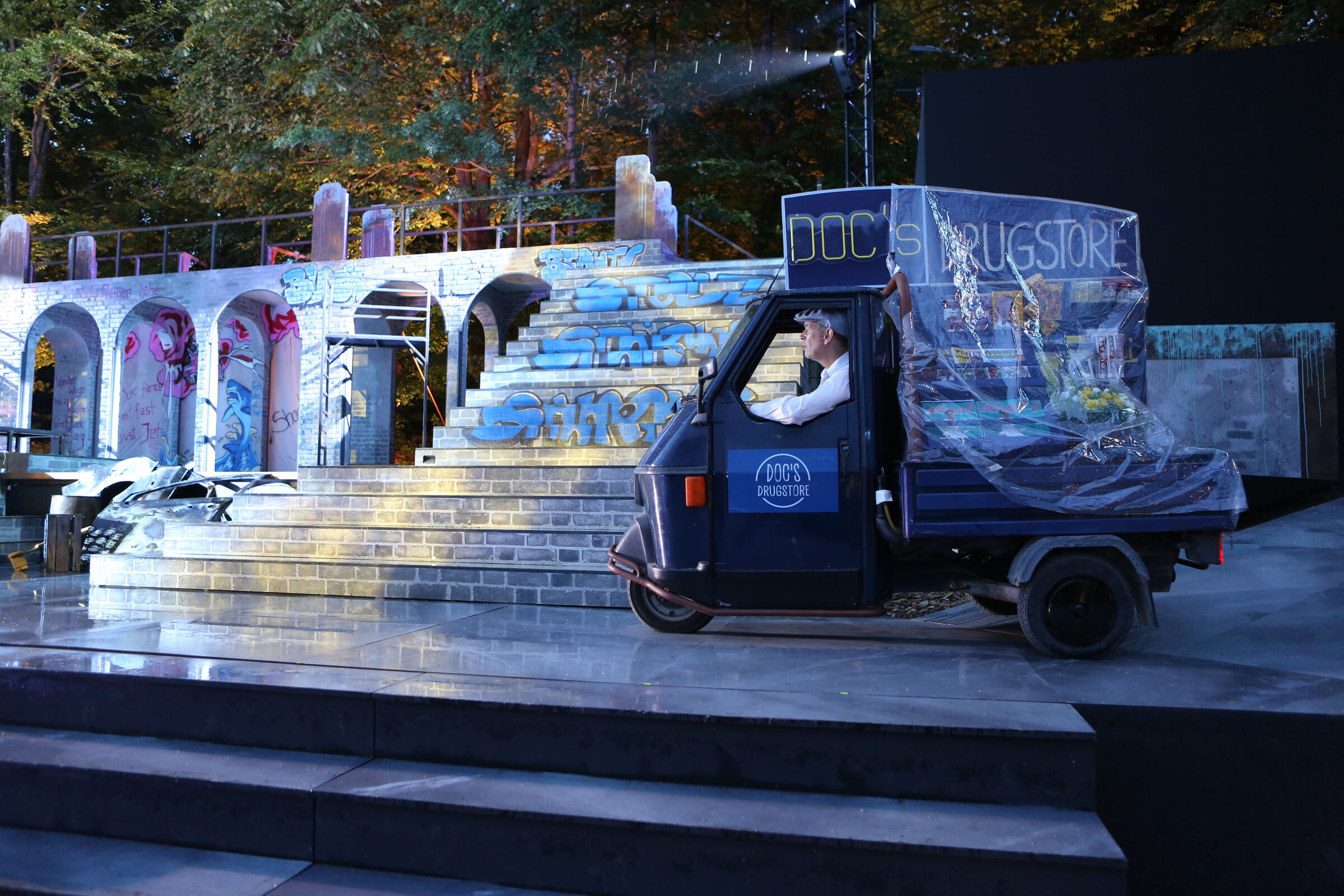 Da der Verlag für den Erhalt der Aufführungsrechte den Veranstaltern vorschreibt, das Musical im New York der 50er/60er Jahre anzusiedeln, lag es für mich nahe, die Szenerie in den Central Park zu legen. Bei meinen Recherchen bin ich auf Fotomaterial von der Bethesda Terrace und mit der im Vordergrund stehenden Bethesda Fountain gestoßen. Auch liegt dieser Platz mit seinem Arkadengang im Central Park am The Lake, so wie die neue Festspielbühne am Eutiner See. In meinem Bühnenbildentwurf sind aber die Arkaden mit den beiden großen Treppen, sowie der Brunnen mit dem Friedensengel nicht im schönen Sandsteinflair des Originalschauplatzes gestaltet, sondern alles ist viel verwahrloster und abgerockter, ein Lost-Place mit verrostetem Brunnen und Gerüsten. Eine in sich geschlossene, eigene Welt, in der Jets und Sharks, die beiden Gangs, nebeneinander existieren.
