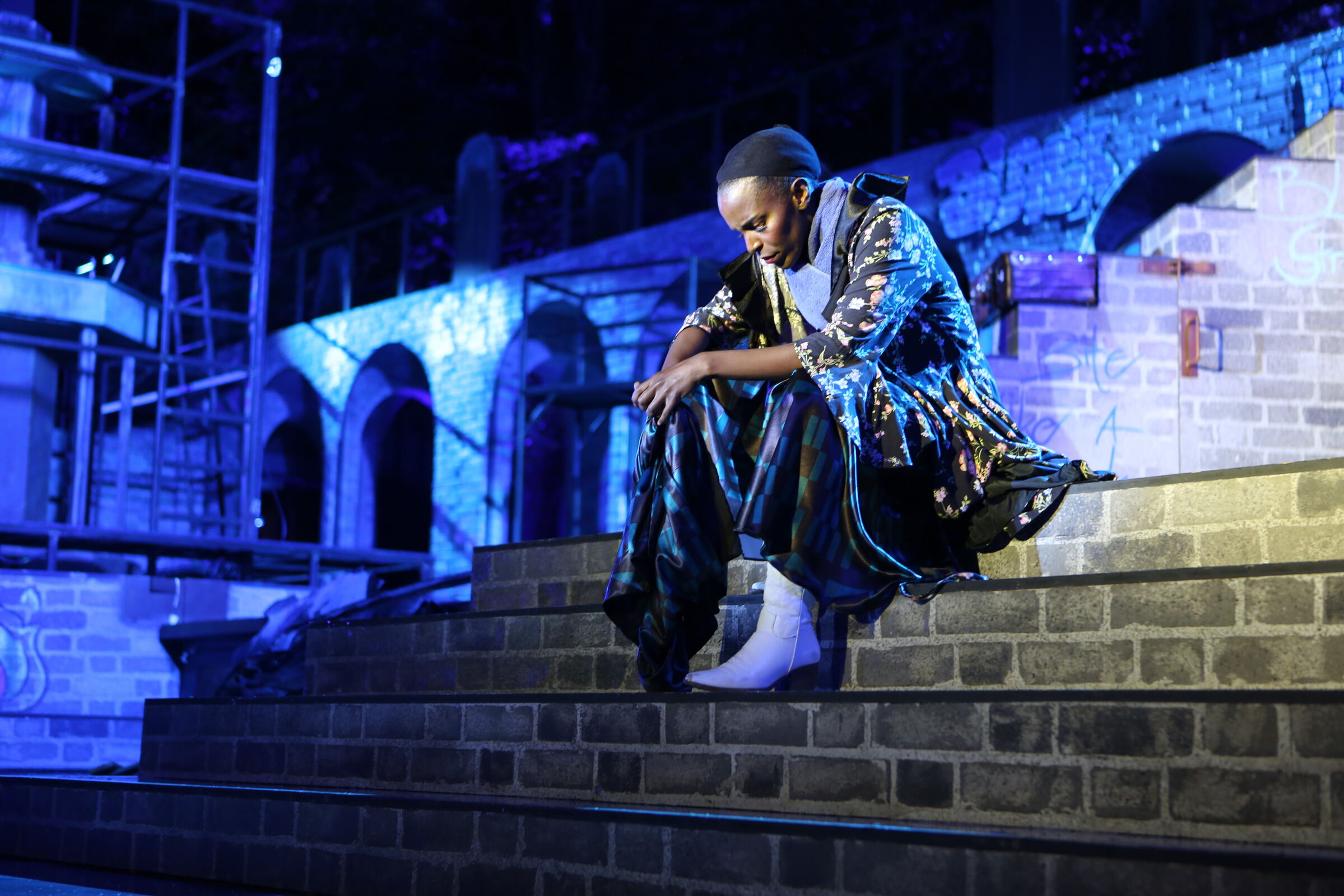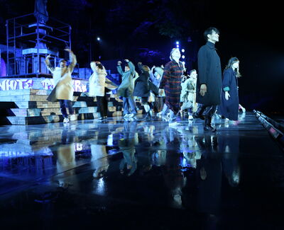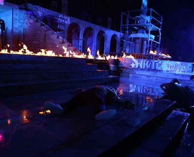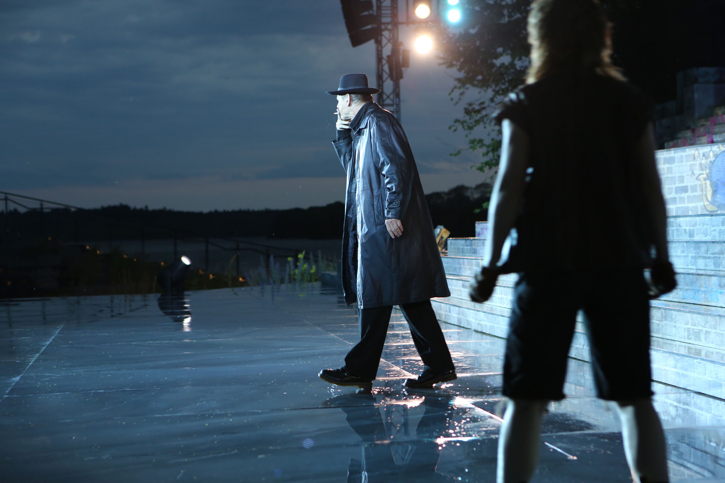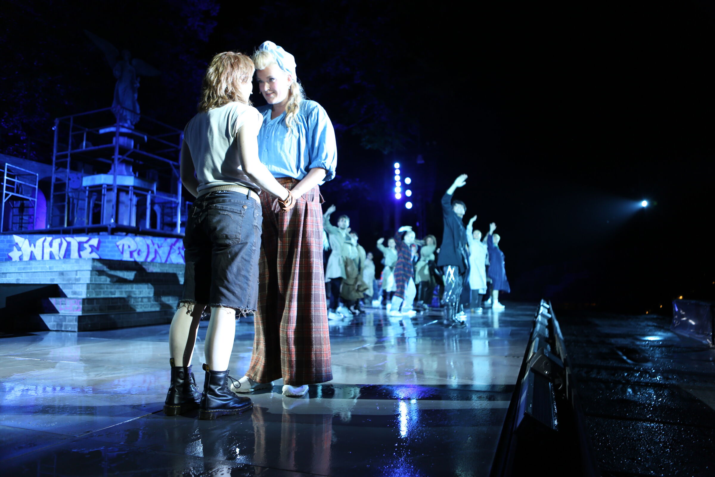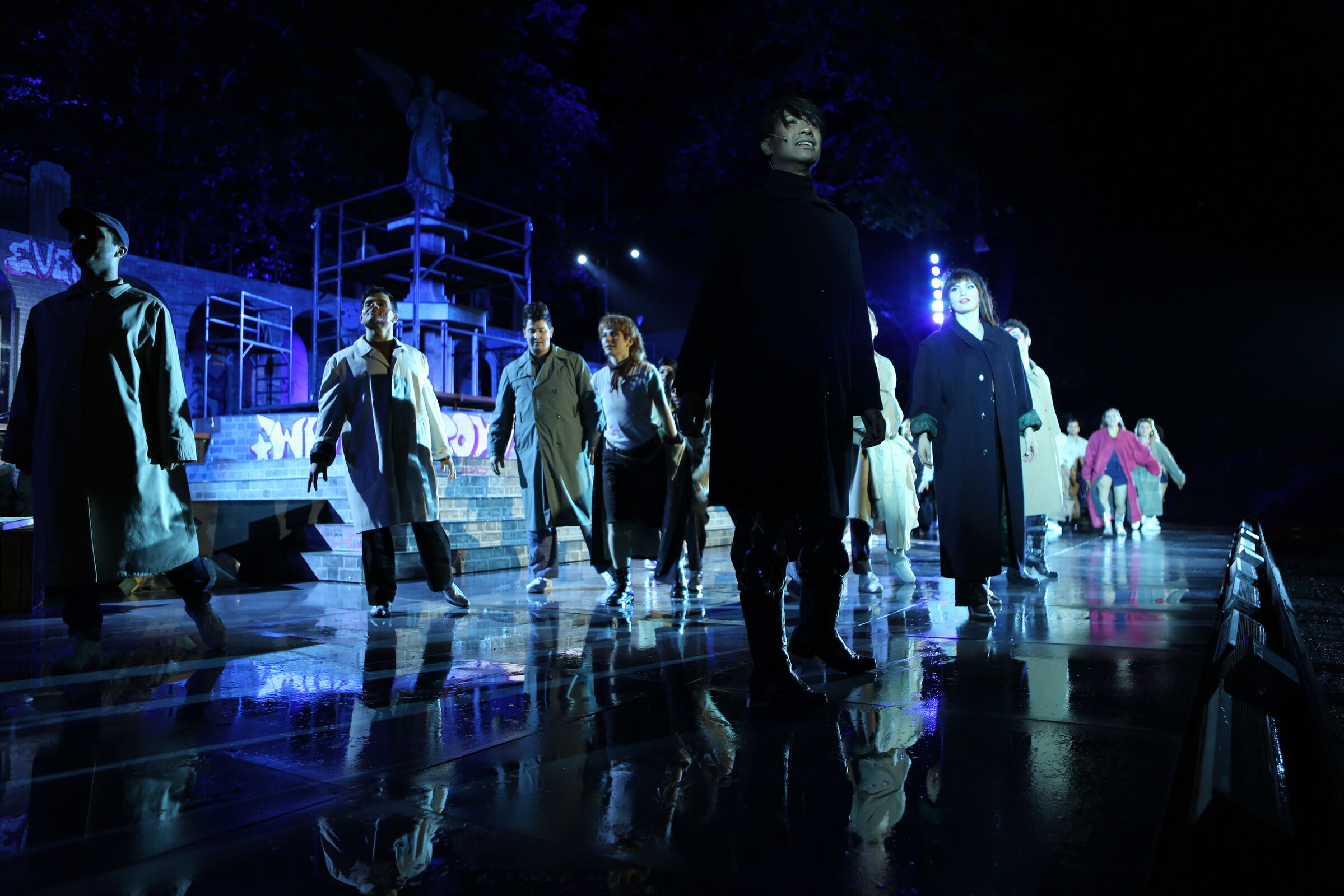 Da der Verlag für den Erhalt der Aufführungsrechte den Veranstaltern vorschreibt, das Musical im New York der 50er/60er Jahre anzusiedeln, lag es für mich nahe, die Szenerie in den Central Park zu legen. Bei meinen Recherchen bin ich auf Fotomaterial von der Bethesda Terrace und mit der im Vordergrund stehenden Bethesda Fountain gestoßen. Auch liegt dieser Platz mit seinem Arkadengang im Central Park am The Lake, so wie die neue Festspielbühne am Eutiner See. In meinem Bühnenbildentwurf sind aber die Arkaden mit den beiden großen Treppen, sowie der Brunnen mit dem Friedensengel nicht im schönen Sandsteinflair des Originalschauplatzes gestaltet, sondern alles ist viel verwahrloster und abgerockter, ein Lost-Place mit verrostetem Brunnen und Gerüsten. Eine in sich geschlossene, eigene Welt, in der Jets und Sharks, die beiden Gangs, nebeneinander existieren.