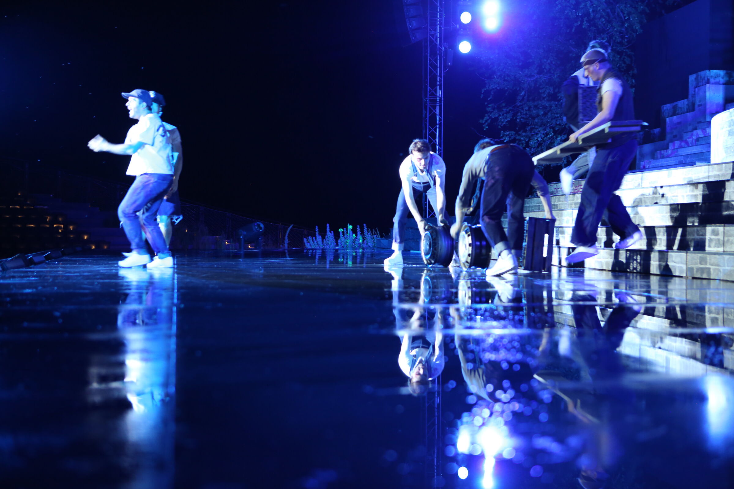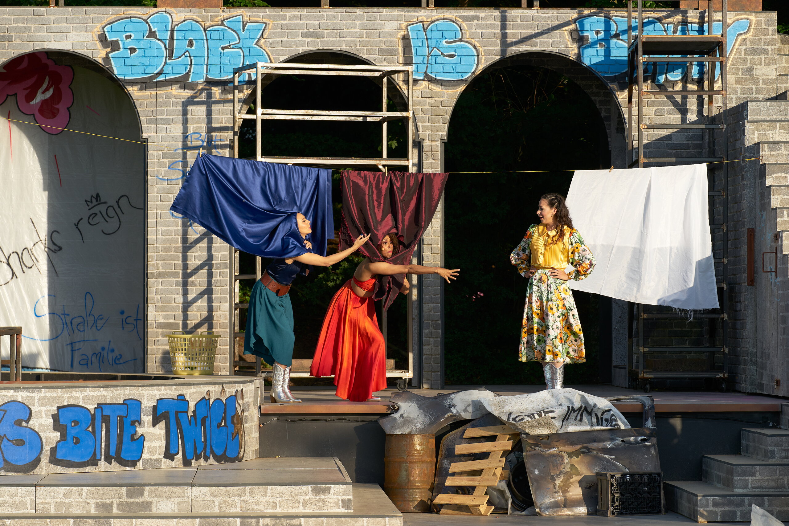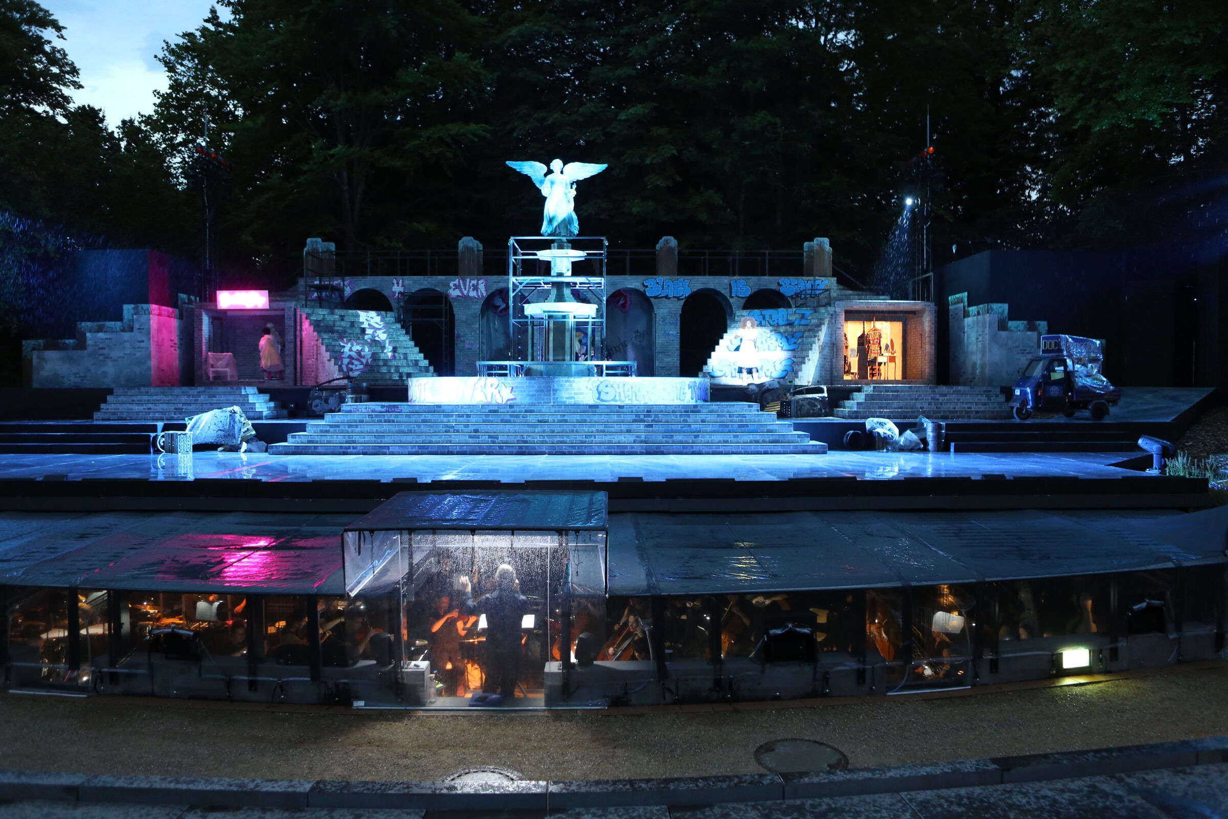Natürlich sind die Eutiner Festspiele eine komplette Outdoor-Veranstaltung, für alle Beteiligten auf und hinter der Bühne ebenso wie auch für die Zuschauer. Bei der Entwicklung der Ideen für die Bühnenbilder spielen die Wetterbedingungen zuerst einmal keine Rolle, jedoch bei der technischen Umsetzung beinflussen Regen, Wind und Sonne naturgemäß die Wahl der Baumaterialien und deren technischen Konstruktionen sowie die Farbgestaltung und Farboberflächen, auch die Verwendung von Vorhängen und großen Tüchern. Das muss alles stabil sein, bestandsfest auch bei Sturmböen und Platzregen. Aber es darf auch nicht zu schwer sein, damit beim schnellen Um- und Abbau die Bühnenarbeiter und gelegentlich auch die DarstellerInnen nicht alle mit Riesenkräften zu Werke gehen müssen.