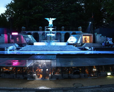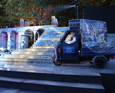 Das war gar nicht schmerzlich, sondern wirklich reizvoll und herausfordernd, im Eutiner Schlossgarten mit dem vorhandenen grünen Hügel im Hintergrund der Bühne als wesentliches Bühnenbild-Merkmal zu arbeiten. Grundsätzlich wäre es sowieso fatal, Häuserschluchten New York's auf die Bühne zu bauen und als Bühnenbildner zu glauben, die vorhandene Natur im Schlossgarten damit verstecken zu können.