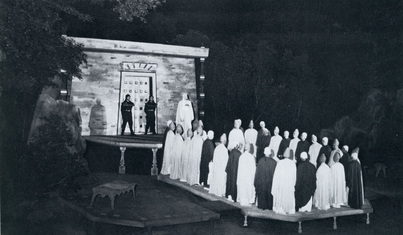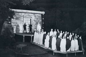 Man richtet sich immer deutlicher „auf die Dauer“ ein. Der vertiefte Orchesterplatz wurde durch eine Mauer aus heimatlichen Findlingen absteifend eingefasst und auf gleiche Weise vom Tribünenplatz abgegrenzt. – Im Mai begann Hans-Werner Gretzler als erfahrungsreicher Bühnenbildner die Bauten für „Fidelio“ und „Martha“. Den „Freischütz“ Szenenbildern liegen wieder Wulff Schwerdtfegers Arbeiten zu Grunde. – Schon vor Monaten nahm der Chor seine Übungen auf; in den ersten Juni-Tagen setzten seine Außenproben auf der Bühne ein.