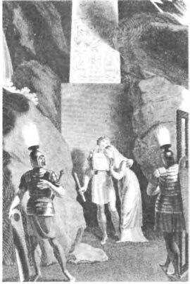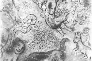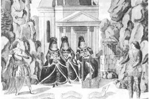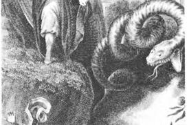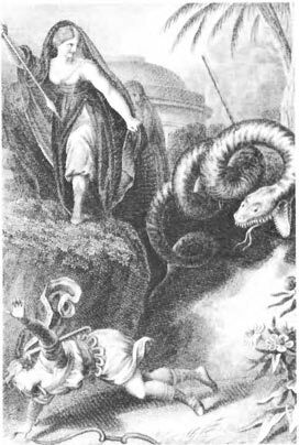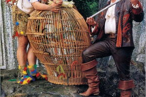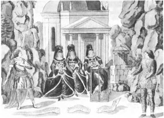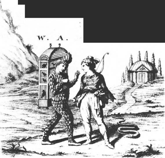 Prinz Tamino wird von einer Schlange verfolgt; er hat seine Pfeile verschossen und sinkt ohnmächtig zu Boden. Drei Damen, Dienerinnen der Königin der Nacht, besiegen das Untier. Als Tamino erwacht, erblickt er Papageno, der für die nächtliche Königin seltsame Vögel fängt. Die drei Damen überreichen Tamino ein Bildnis von Pamina, der Tochter ihrer Königin. Tamino verliebt sich in das Bildnis ...