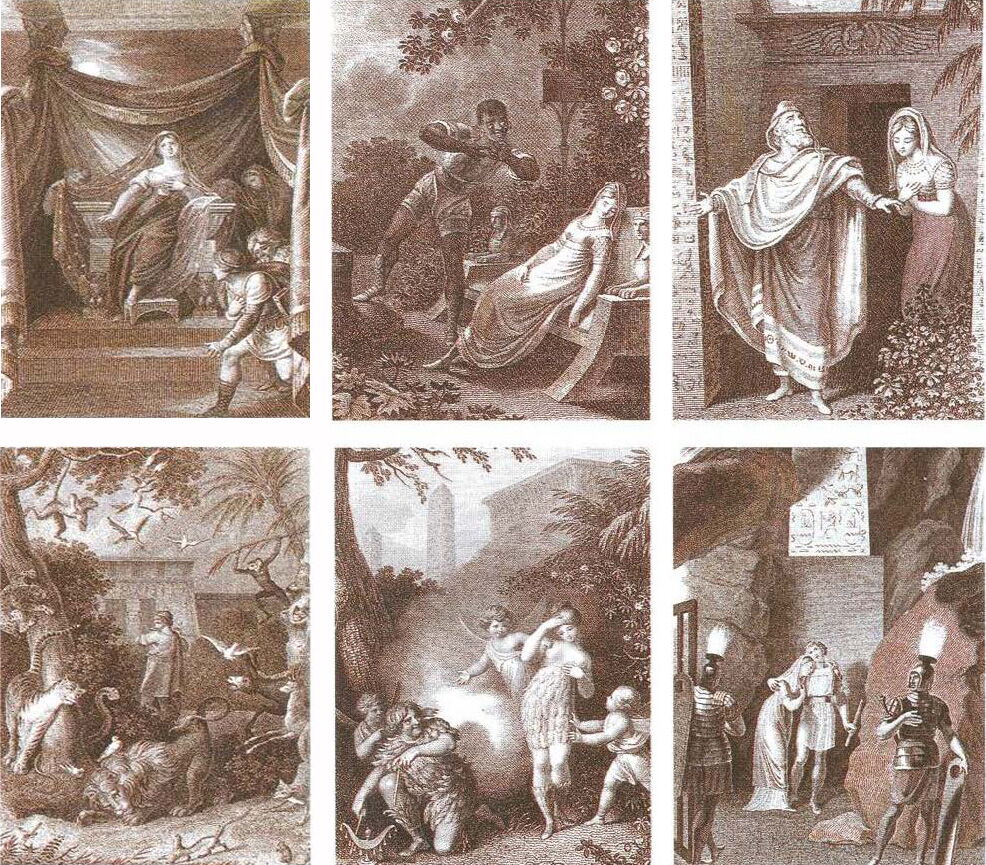 Prinz Tamino wird von einer Schlange verfolgt; er hat seine Pfeile verschossen und sinkt ohnmächtig zu Boden. Drei Damen, Dienerinnen der Königin der Nacht, besiegen das Untier. Als Tamino erwacht, erblickt er Papageno, der für die nächtliche Königin seltsame Vögel fängt. Die drei Damen überreichen Tamino ein Bildnis von Pamina, der Tochter ihrer Königin. Tamino verliebt sich in das Bildnis ...